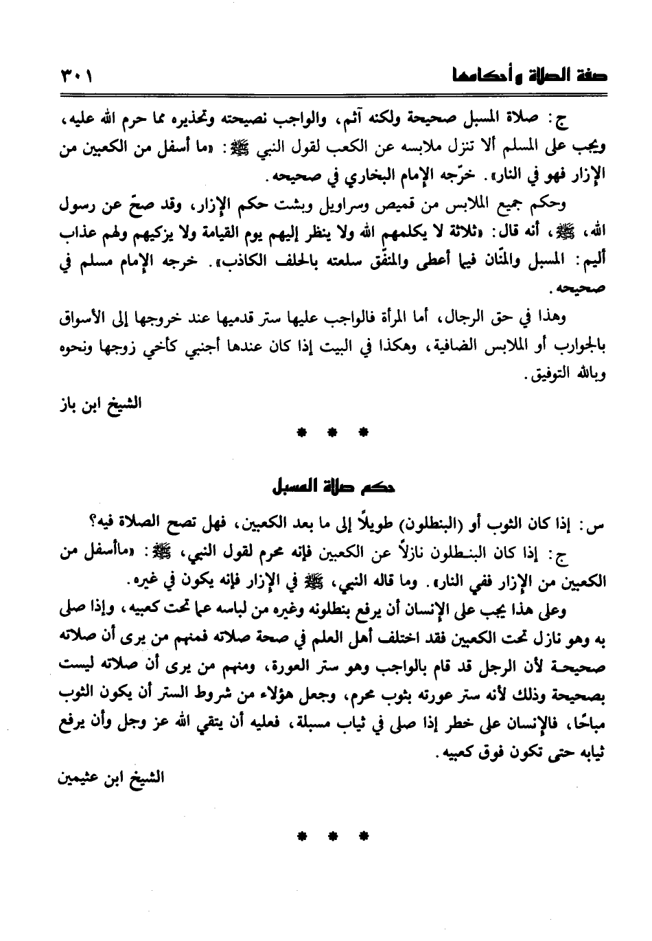 ج صلاة المسبل صحيحة ولكنه آثم، والواجب نصيحته وتحذيره مما حرم الله عليه، ويحب على المسلم ألا تنزل ملابسه عن الكعب لقول النبي صلى الله عليه وسلم " ما أسفل من الكعبين من الإزار فهو في النار ". خرّجه الإمام البخاري في صحيحه. وحكم جميع الملابس من قميص وسراويل وبشت وحكم الإزار، وقد صحّ عن رسول الله صلى الله عليه وسلم أنه قال " ثلاثة لا يكلمهم الله ولا ينظر إليهم يوم القيامة ولا يزكيهم ولهم عذاب أليم المسبل والمنان فيما أعطى والمنفق سلعته بالحلف الكاذب ". خرجه الإمام مسلم في صحيحه.