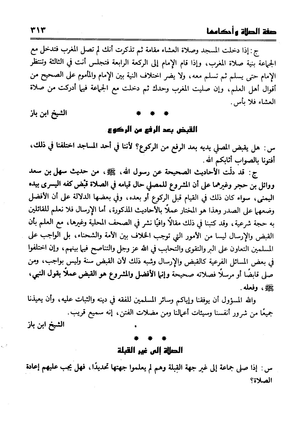 ج قد دلت الأحاديث الصحيحة عن رسول الله صلى الله عليه وسلم من حديث سهل بن سعد ووائل بن حجر وغيرهما على أن المشروع للمصلي حال قيامه في الصلاة قبْض كفه اليسرى بيده اليمنى، سواء كان ذلك في القيام قبل الركوع أو بعده، وفي بعضها الدلالة على أن الأفضل وضعهما على الصدر وهذا هو المختار عملاً بالأحاديث المذكورة، أما الإرسال فلا نعلم للقائلين به حجة شرعية، وقد كتبنا في ذلك مقالاً وافيًا نشر في الصحف المحلية وغيرها، مع العلم بأن القبض والإرسال ليسا من الأمور التي توجب الخلاف بين الأمة والشحناء، بل الواجب على المسلمين التعاون على البر والتقوى والتحابب في الله عز وجل والتناصح فيما بينهم، وإن اختلفوا في بعض المسائل الفرعية كالقبض والإرسال وشبه ذلك لأن القبض سنة وليس بواجب، ومن صلى قابضًا أو مرسلاً فصلاته صحيحة وإنما الأفضل والمشروع هو القبض عملا بقول النبي صلى الله عليه وسلم وفعله. والله المسؤول أن يوفقنا وإياكم وسائر المسلمين للفقه في دينه والثبات عليه، وأن يعيذنا جميعًا من شرور أنفسنا وسيئات أعمالنا ومن مضلات الفتن، إنه سميع قريب.