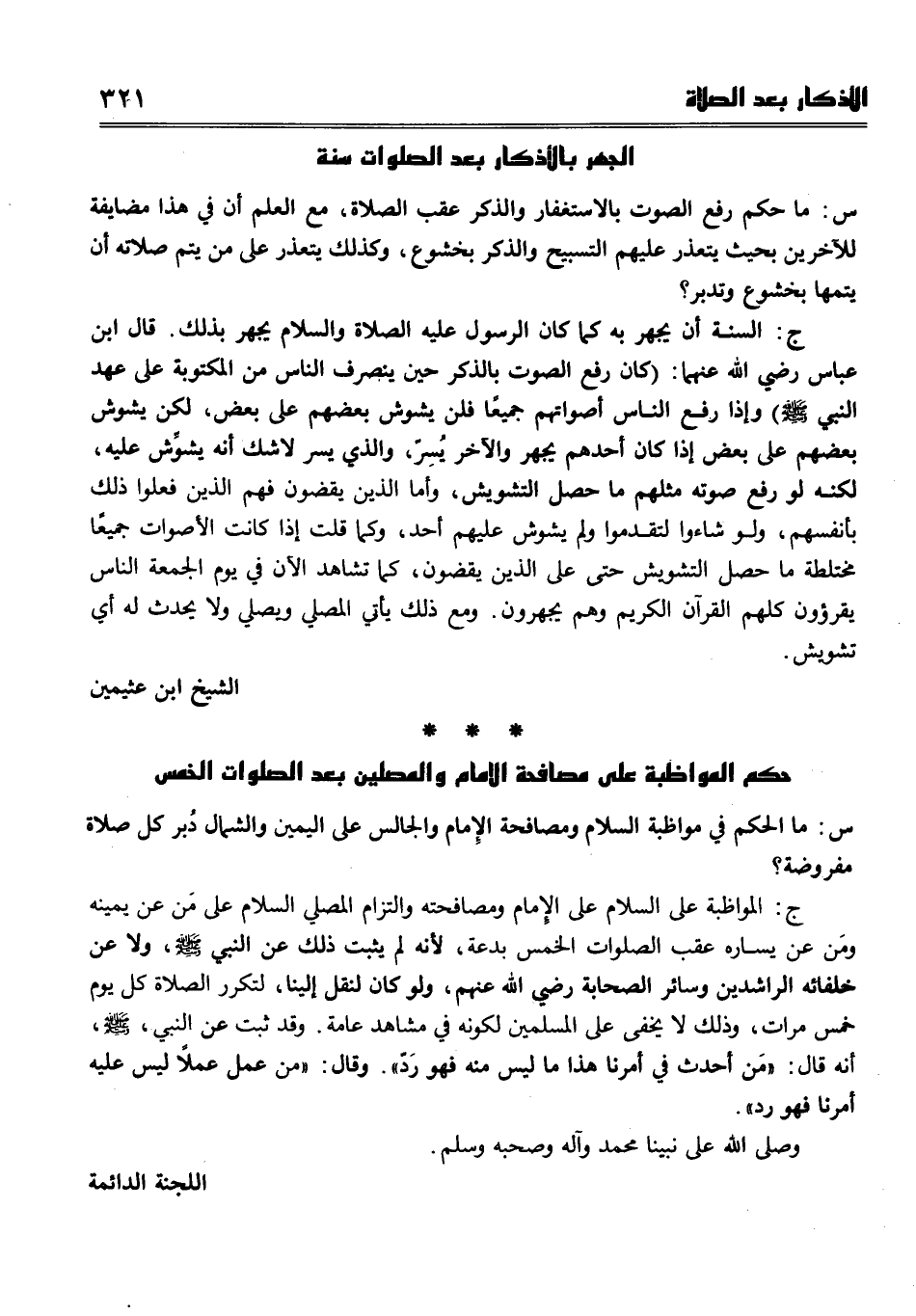 ج المواظبة على السلام على الإمام ومصافحته والتزام المصلي السلام على مَن عن يمينه ومَن عن يساره عقب الصللوات الخمس بدعة، لأنه لم يثبت ذلك عن النبي صلى الله عليه وسلم ولا عن خلفائه الراشدين وسائر الصحابة رضي الله عنهم ولو كان لنقل إلينا لتكرر الصلاة كل يوم خمس مرات، وذلك لا يخفى على المسلمين لكونه في مشاهد عامة. وقد ثبت عن النبي صلى الله عليه وسلم أنه قال " من أحدث في أمرنا هذا ما ليس منه فهو رد " وقال " من عمل عملا ليس عليه أمرنا فهو رد ". وصلى الله على نبينا محمد وآله وصحبه وسلم.