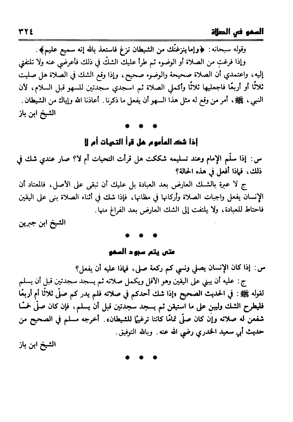وقوله سبحانه {وَإِمَّا يَنْزَغَنَّكَ مِنَ الشَّيْطَانِ نَزْغٌ فَاسْتَعِذْ بِاللَّهِ إِنَّهُ سَمِيعٌ عَلِيمٌ} . وإذا فرغتِ من الصلاة أو الوضوء ثم طرأ عليك الشك في ذلك فأعرضي عنه ولا تلتفتي إليه واعتمدي أن الصلاة صحيحة والوضوء صحيح، وإذا وقع الشك في الصلاة هل صليت ثلاثا أو أربعا فاجعليها ثلاثا وأكملي الصلاة ثم اسجدي سجدتين للسهو قبل السلام، لأن النبي صلى الله عليه وسلم أمر من وقع له مثل هذا السهو أن يفعل ما ذكرنا، أعاذنا الله وإياك من الشيطان.