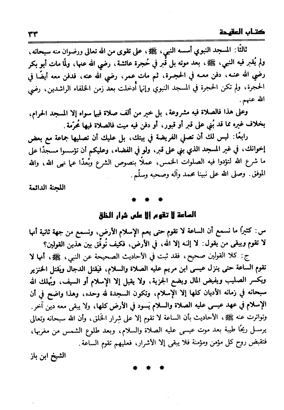 ج كلا القولين صحيح فقد ثبت في الأحاديث الصحيحة عن النبي صلى الله عليه وسلم أنها لا تقوم الساعة حتى ينزل عيسى ابن مريم عليه الصلاة والسلام فيقتل الدجال ويقتل الخنزير ويكسر الصليب ويفيض المال ويضع الجزية ولا يقبل إلا الإسلام أو السيف ويُهلك الله سبحانه في زمانه الأديان كلها إلا الإسلام وتكون السجدة لله وحده، وهذا واضح في أن الإسلام في عهد عيسى عليه الصلاة والسلام يَسود في الأرض كلها ولا يبقى معه دين آخر. وتواترت عنه صلى الله عليه وسلم الأحاديث بأن الساعة لا تقوم إلا على شِرار الخَلق وأن الله سبحانه وتعالى يرسل ريحا طيبة بعد موت عيسى عليه الصلاة والسلام، وبعد طلوع الشمس من مغربها، فتقبض روح كل مؤمن ومؤمنة إلا الأشرار، فعليهم تقوم الساعة.