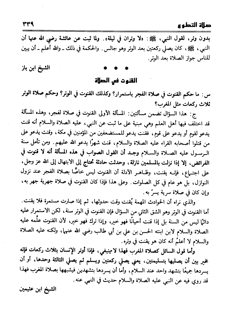 ج هذا السؤال تضمن مسألتين المسألة الأولى القنوت في صلاة الفجر، وهذه المسألة قد اختلف فيها أهل العلم وهي مبنية على ما ثبت عن النبي صلى الله عليه وسلم أنه قنت يدعو لقوم أو يدعو على قوم، فقنت يدعو للمستضعفين من المؤمنين في مكة، وقنت يدعو على من قتلوا أصحابه القراء عليه الصلاة والسلام، قنت شهرًا يدعو الله عليهم. ومن تأمل سنة الرسول عليه الصلاة والسلام وجد أن القول الصواب في هذه المسألة أنه لا قنوت في الفرائض، إلا إذا نزلت بالمسلمين نازلة، وحدثت حادثة تحتاج إلى الابتهال إلى الله عز وجل، على اجتماع، فإنه يقنت، وظاهر الأدلة أن القنوت ليس خاصًّا بصلاة الفجر عند نزول النوازل، بل هو عام في كل الصلوات، وعلى هذا فإن كان القنوت في صلاة جهرية جهر به، وإن كان ي صلاة سرية سر به، والذي نراه أن الحوادث المهمة يُقنت وقت حدوثها، ثم إذا صارت مستمرة فلا يقنت. أما القنوت في الوتر وهو الشق الثاني من السؤال فإن القنوت في الوتر سنة، لكن الاستمرار عليه دائمًا ليس من السنة بل إذا قنت أحيانًا فهو خير، وإذا ترك فهو خير، لأن القنوت علمه عليه الصلاة والسلام لابن ابنته الحسن بن علي بن أبي طالب رضي الله عنهما، ولكنه عليه الصلاة والسلام لا أعلمُ له أنه كان هو يقنت في وتره. وأما قول السائل كصلاة المغرب فهذا لا ينبغي، فإذا أوتر الإنسان بثلاث ركعات فإنه مخير بين أن يصليها بتسليمتين، يعني يصلي ركعتين ويسلم ثم يصلي الثالثة وحدها، أو أن يسردها جميعًا بتشهد واحد عند السلام، وأما أن يسردها بتشهدين فيشبهها بصلاة المغرب فهذا قد روي فيه عن النبي عليه الصلاة والسلام حديث في النهي عنه.
