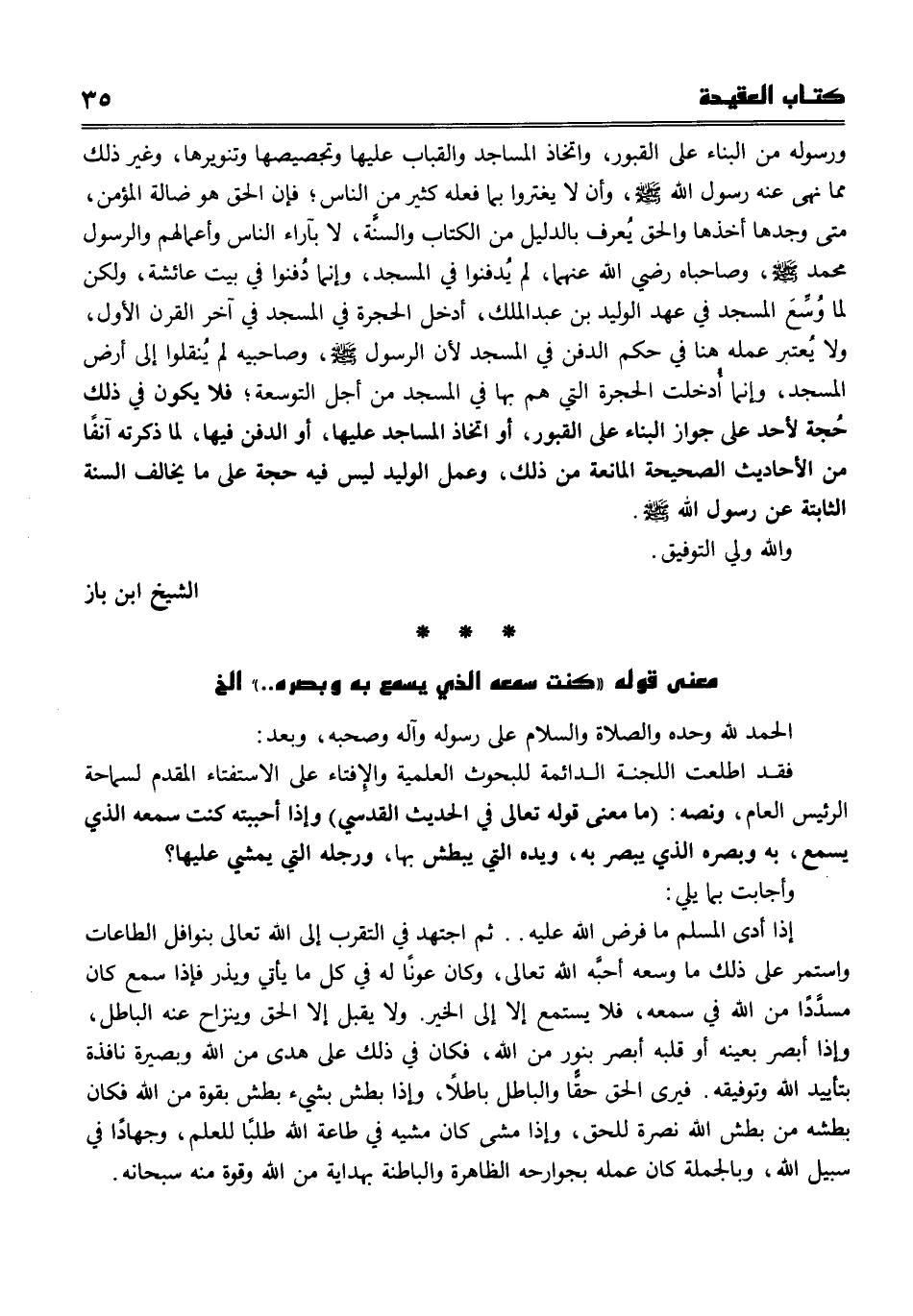 ورسوله من البناء على القبور، واتخاذ المساجد والقباب عليها وتجصيصها وتنويرها، وغير ذلك مما نهى عنه رسول الله صلى الله عليه وسلم، وأن لا يغتروا بما فعله كثير من الناس، فإن الحق هو ضالة المؤمن متى وجدها أخذها، والحق يُعرف بالدليل من الكتاب والسنة لا بآراء الناس وأعمالهم، والرسول محمد صلى الله عليه وسلم وصاحباه رضي الله عنهما لم يُدفنوا في المسجد وإنما دُفنوا في بيت عائشة، ولكن لما وُسِّع المسجد في عهد الوليد بن عبد الملك أدخل الحجرة في المسجد في آخر القرن الأول، ولا يُعتبر عمله هنا في حكم الدفن في المسجد. لأن الرسول صلى الله عليه وسلم وصاحبيه لم يُنقلوا إلى أرض المسجد وإنما أُدخلت الحجرة التي هم بها في المسجد من أجل التوسعة، فلا يكون في ذلك حجة لأحد على جواز البناء على القبور أو اتخاذ المساجد عليها أو الدفن فيها، لما ذكرته آنفًا من الأحاديث الصحيحة المانعة من ذلك، وعمل الوليد ليس فيه حجة على ما يخالف السنة الثابتة عن رسول الله، والله ولي التوفيق.