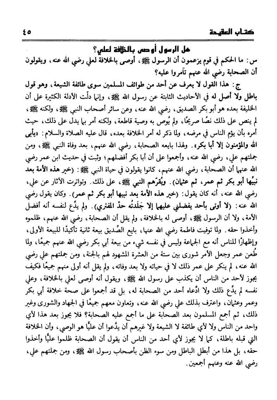 ج هذا القول لا يعرف عن أحد من طوائف المسلمين سوى طائفة الشيعة، وهو قول باطل ولا أصل له في الأحاديث الثابتة عن رسول الله صلى الله عليه وسلم، وإنما دلت الأدلة الكثيرة على أن الخليفة بعده هو أبو بكر الصديق رضي الله عنه عنه، وعن سائر أصحاب النبي صلى الله عليه وسلم، ولكنه صلى الله عليه وسلم لم ينص على ذلك نصا صريحا ولم يوص به وصية قاطعة ولكنه أمر بما يدل على ذلك حيث أمره بأن يؤم الناس في مرضه، ولما ذكر له أمر الخلافة بعده قال عليه الصلاة والسلام " يأبى الله والمؤمنون إلا أبا بكر ". ولهذا بايعه الصحابة رضي الله عنهم بعد وفاة النبي صلى الله عليه وسلم ومن جملتهم علي رضي الله عنه، وأجمعوا على أن أبا بكر أفضلهم، وثبت في حديث ابن عمر رضي الله عنهما أن الصحابة رضي الله عنهم كانوا يقولون في حياة النبي صلى الله عليه وسلم (خير هذه الأمة بعد نبيها أبو بكر ثم عمر ثم عثمان) ويُقرهم النبي صلى الله عليه وسلم على ذلك. وتواترت الآثار عن علي رضي الله عنه أنه كان يقول (خير هذه الأمة بعد نبيها أبو بكر ثم عمر) . وكان يقول رضي الله عنه (لا أوتى بأحد يفضلني عليهما إلا جلدته حد المفتري) . ولم يدِّع يوما لنفسه أنه أفضل الأمة ولا أن الرسول صلى الله عليه وسلم أوصى له بالخلافة، ولم يقل أن الصحابة رضي الله عنهم ظلموه وأخذوا حقه. ولما توفيت فاطمة رضي الله عنها بايع الصديق بيعة ثانية تأكيدا للبيعة الأولى، وإظهارًا للناس أنه مع الجماعة وليس في نفسه شيء من بيعة أبي بكر رضي الله عنهم جميعا ولما طُعن عمر وجعل الأمر شورى بين ستة من العشرة المشهود لهم بالجنة، ومن جملتهم علي رضي الله عنه لم ينكر على عمر ذلك لا في حياته ولا بعد وفاته، ولم يقل أنه أولى منهم جميعا فكيف يجوز لأحد من الناس أن يكذب على رسول الله صلى الله عليه وسلم ويقول إنه أوصى لعلي بالخلافة، وعلي نفسه لم يدِّع ذلك ولا ادعاه أحد من الصحابة له، بل قد أجمعوا على صحة خلافة أبي بكر وعمر وعثمان واعترف بذلك علي رضي الله عنه وتعاون معهم جميعا في الجهاد والشورى وغير ذلك، ثم أجمع المسلمون بعد الصحابة على ما أجمع عليه الصحابة فلا يجوز بعد هذا لأي أحد من الناس ولا لأي طائفة لا الشيعة ولا غيرهم أن يدعوا أن عليا هو الوصي وأن الخلافة التي قبله باطلة، كما لا يجوز لأي أحد من الناس أن يقول إن الصحابة ظلموا عليا وأخذوا حقه، بل هذا من أبطل الباطل ومن سوء الظن بأصحاب رسول الله صلى الله عليه وسلم ومن جملتهم علي رضي الله عنه وعنهم أجمعين.