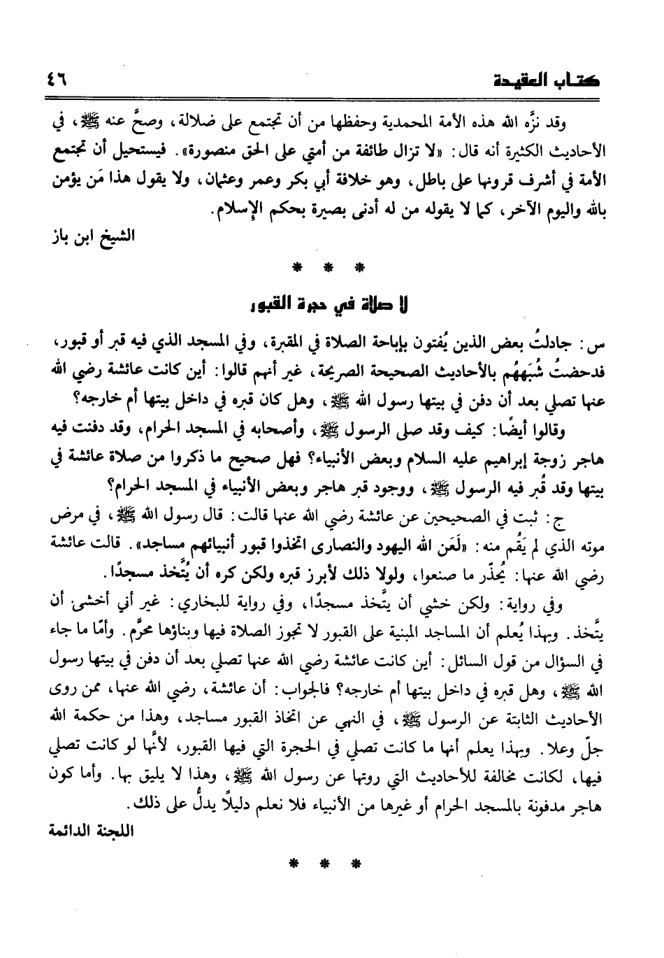س جادلتُ بعض الذين يُفتون بإباحة الصلاة في المقبرة، وفي المسجد الذي فيه قبر أوقبور، فدحضت شبههم بالأحاديث الصحيحة الصريحة، غير أنهم قالوا أين كانت عائشة رضي الله عنها تصلي بعد أن دفن في بيتها رسول الله صلى الله عليه وسلم، وهل كان قبره في داخل بيتها أم خارجه؟ وقالوا أيضا كيف وقد صلى الرسول صلى الله عليه وسلم وأصحابه في المسجد الحرام، وقد دفنت فيه هاجر زوج إبراهيم عليه السلام وبعض الأنبياء؟ وعلى هذا فإني ألتمس منك يا فضيلة الشيخ أن تخبرني هل صحيح ما ذكروا من وجود هاجر في البيت الحرام وبعض الأنبياء, وهل صحيح أن عائشة كانت تصلي في بيتها وقد قُبر فيه الرسول الله صلى الله عليه وسلم، ووجود قبر هاجر وبعض الأنبياء في المسجد الحرام؟