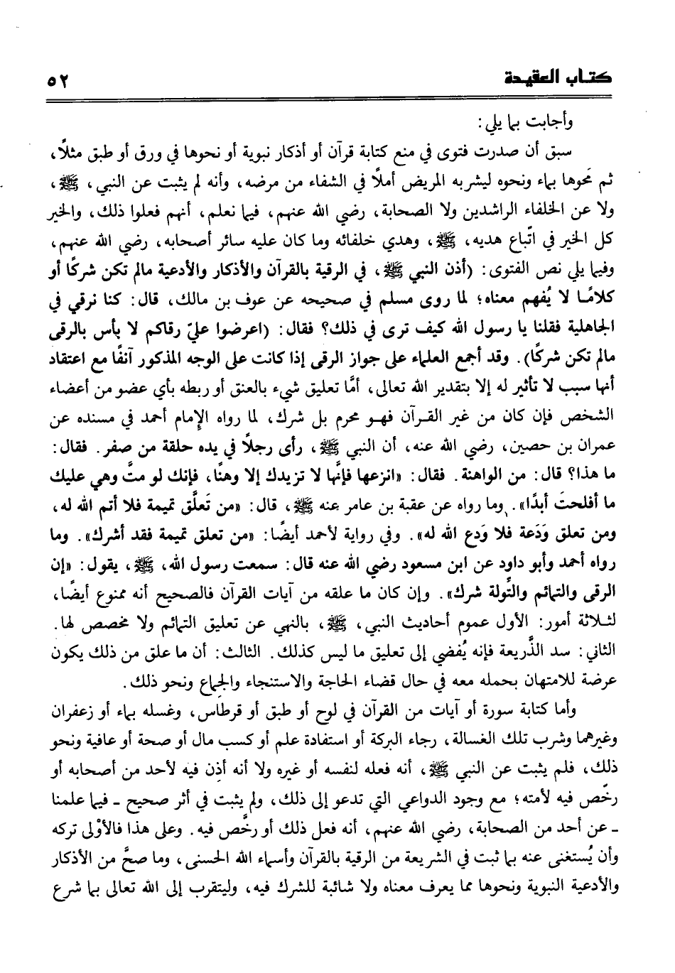 سبق أن صدرت فتوى في منع كتابة قرآن أو أذكار نبوية أو نحوها في ورق أو طبق مثلاً، ثم مَحْوها بماء ونحوه ليشربه المريض أملاً في الشفاء من مرضه، وأنه لم يثبت عن النبي صلى الله عليه وسلم، ولا عن الخلفاء الراشدين ولا الصحابة، رضي الله عنهم فيما نعلم، أنهم فعلوا ذلك، والخير كل الخير في اتّباع هديه، صلى الله عليه وسلم، وهدي خلفائه وما كان عليه سائر أصحابه، رضي الله عنهم، وفيما يلي نص الفتوى (أذن النبي صلى الله عليه وسلم في الرقية بالقرآن والأذكار والأدعية مالم تكن شركًا أو كلامًا لا يُفهم معناه؛ لما روى مسلم في صحيحه عن عوف بن مالك، قال كنا نرقى في الجاهلية فقلنا يا رسول الله كيف ترى في ذلك؟ فقال " اعرضوا عليّ رقاكم لابأس بالرقى مالم تكن شركًا ". وقد أجمع العلماء على جواز الرقى إذا كانت على الوجه المذكور آنفًا مع اعتقاد أنها سبب لا تأثير له إلا بتقدير الله تعالى، أمَّا تعليق شيء بالعنق أوربطه بأي عضو من أعضاء الشخص فإ ن كان من غير القرآن فهو محرم بل شرك، لما رواه الإمام أحمد في مسنده عن عمران بن الحصين، رضي الله عنه، أن النبي صلى الله عليه وسلم، رأى رجلاً في يده حلقه من صفر. فقال ما هذا؟ قال من الواهنة. فقال " انزعها فإنَّها لا تزيدك إلا وهنًا، فإنك لو متَّ وهي عليك ما أفلحت أبدًا ". وما رواه عن عقبة بن عامر عنه صلى الله عليه وسلم، قال " من تعلَّق تميمة فلا أتم الله له، ومن تعلق وَدَعة فلا وَدع الله له ". وفي رواية لأحمد أيضًا " من تعلق تميمة فقد أشرك ". وما رواه أحمد وأبوداود عن ابن مسعود رضي الله عنه قال سمعت رسول الله، صلى الله عليه وسلم، يقول " إن الرقى والتائم والتِّولة شرك ". وإن كان ما علقه من آيات القرآن فالصحيح أنه ممنوع أيضًا، لثلاثة أمور الأول عموم أحاديث النبي، صلى الله عليه وسلم، بالنهي عن تعليق التمائم ولا مُخصص لها. الثاني سد الذَّريعة فإنه يُفضي إلى تعليق ما ليس كذلك. الثالث أن ما علق من ذلك يكون عرضة للامتهان بحمله معه في حال قضاء الحاجة والاستنجاء والجماع ونحو ذلك. وأما كتابة سورة أو آيات من القرآن في لوح أو طبق أو قرطاس، وغسله بماء أو زعفران وغيرهما وشرب تلك الغسالة، رجاء البركة أو استفادة علم أو كسب مال أو صحة أو عافية ونحو ذلك، فلم يثبت عن النبي صلى الله عليه وسلم، أنه فعله لنفسه أو غيره ولا أنه أذِن فيه لأحد من أصحابه أو رخّص فيه لأمته؛ مع وجود الدواعي التي تدعو إلى ذلك، ولم يثبت في أثر صحيح - فيما علمنا - عن أحد من الصحابة، رضي الله عنهم، أنه فعل ذلك أو رخَّص فيه. وعلى هذا فالأولى تركه وأن يُستغنى عنه بما ثبت في الشريعة من الرقية بالقرآن وأسماء الله الحسنى، وما صحَّ من الأذكار والأدعية النبوية ونحوها مما يعرف معناه ولا شائبة للشرك فيه، وليتقرب إلى الله تعالى بما شرع