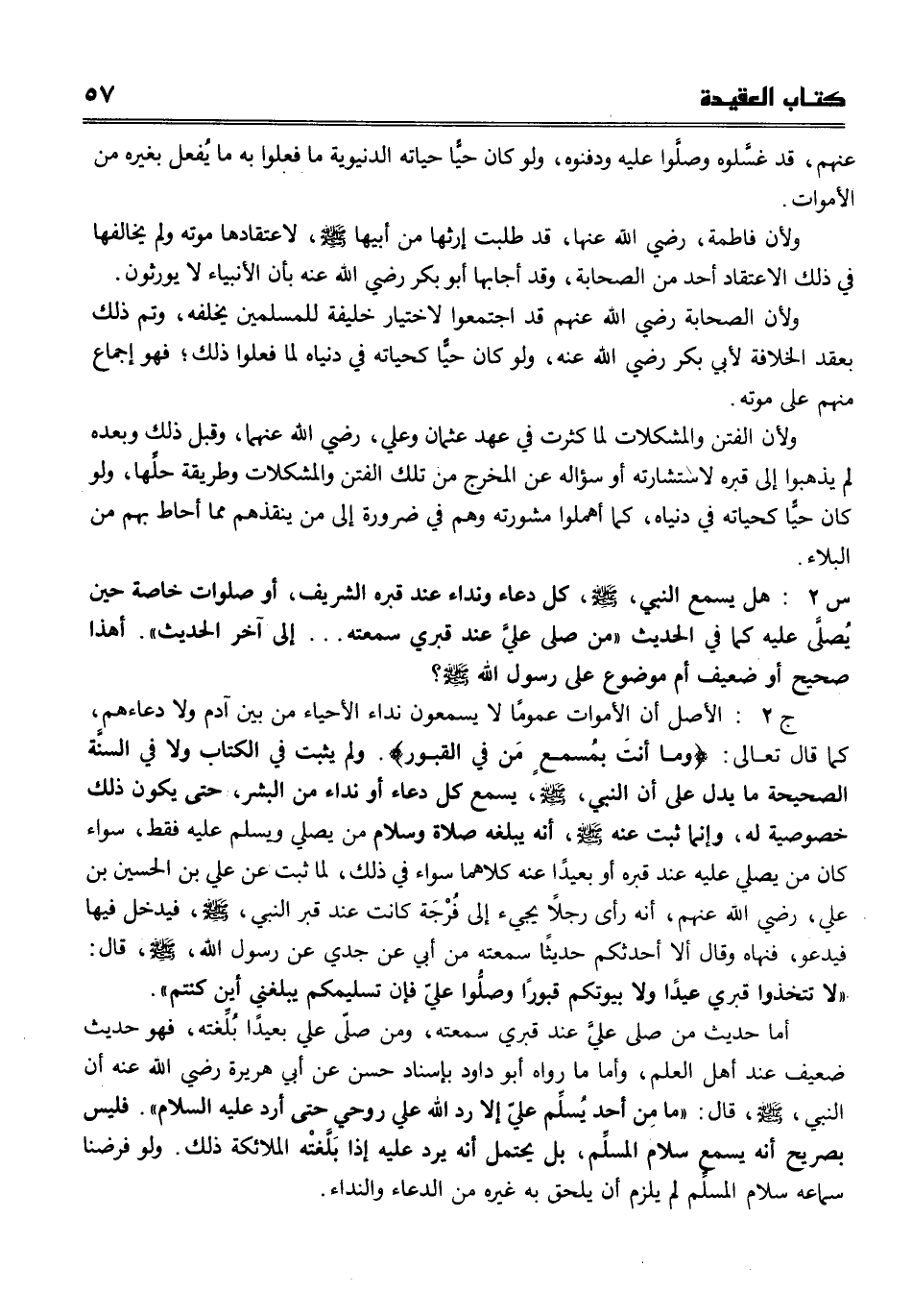 عنهم قد غسلوه وكفنوه وصلوا عليه ودفنوه، ولو كان حيا حياته الدنيوية ما فعلوا به ما يفعل بغيره من الأموات، ولأن فاطمة رضي الله عنها قد طلبت إرثها من أبيها صلى الله عليه وسلم لاعتقادها بموته، ولم يخالفها في ذلك الاعتقاد أحد من الصحابة، وقد أجابها أبو بكر رضي الله عنه بأن الأنبياء لا يورثون ولأن الصحابة رضي الله عنهم قد اجتمعوا لاختيار خليفة للمسلمين يخلفه، وتم ذلك بعقد الخلافة لأبي بكر رضي الله عنه، ولو كان حيا كحياته في دنياه لما فعلوا ذلك، فهو إجماع منهم على موته، ولأن الفتن والمشاكل لما كثرت في عهد عثمان وعلي رضي الله عنهما، وقبل ذلك وبعده لم يذهبوا إلى قبره لاستشارته أو سؤاله في المخرج من تلك الفتن والمشكلات وطريقة حلها، ولو كان حيا كحياته في دنياه لما أهملوا ذلك وهم في ضرورة إلى من ينقذهم مما أحاط بهم من البلاء.