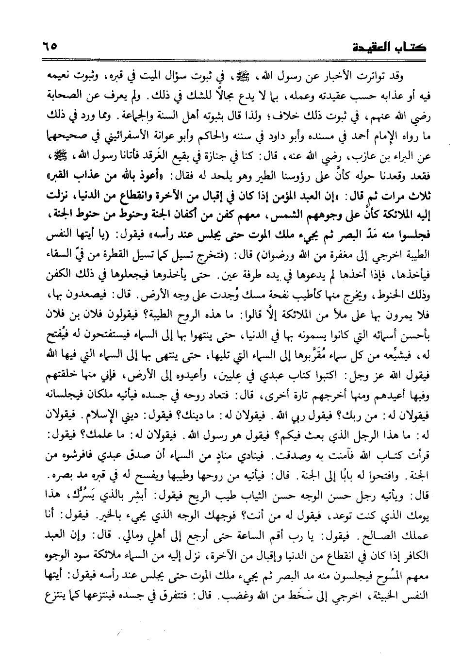 وقد تواترت الأخبار عن رسول الله صلى الله عليه وسلم في ثبوت سؤال الميت في قبره، وثبوت نعيمه فيه أو عذابه حسب عقيدته وعمله، بما لايدع مجالا للشك في ذلك. ولم يعرف عن الصحابة رضى الله عنهم في ثبوت ذلك خلاف، ولذا قال بثبوته أهل السنة والجماعة. ومما ورد في ذلك ما رواه الإمام أحمد في مسنده وأبو داود في سنته والحاكم وأبو عوانة الأسفرائيني في صحيحهما عن البراء بن عازب، رضى الله عنه قال كنا في جنازه في بقيع الغَرقد فأتانا رسول الله صلى الله عليه وسلم، فقعد وقعدنا حوله كأنَّ على رؤوسنا الطير وهو يلحد له فقال " أعوذ بالله من عذاب القبر) " ثلاث مرات، ثم قال " إن العبد المؤمن إذا كان في إقبال من الآخر وانقطاع من الدنيا، نزلت إليه الملائكة كأنَّ على وجوههم الشمس، معهم كفن من أكفان الجنة وحنوط من حنوط الجنة، فجلسوا منه مدَّ البصر ثم يجىء ملك الموت حتى يجلس عند رأسه " فيقول (يا أيتها النفس الطيبة اخرجي إلى مغفرة من الله ورضوان) قال (فتخرج تسيل كما تسيل القطرة من فيّ السقاء فيأخذها، فإذا أخذها لم يدعوها في يده طرفة عين. حتى يأخذوها فيجعلوها فبي ذلك الكفن وذلك الحنوط، ويخرج منها كأطيب نفحة مسك وُجدت على وجه الأرض. قال فيصعدون بها، فلا يمرون بها على ملأ من الملائكة إلا قالوا ما هذه الروح الطيبة؟ فيقولون فلا بن فلان بأحسن أسمائه التي كانوا يسمونه بها الدينا، حتى ينتهوا بها إلى السماء فيستفتحون له فيُفتح له، فيُشيِّعه من كل سماء مُقرَّبوها إلى السماء التي تليها، حتى ينتهي بها إلى السماء التي فيها الله فيقول الله عز وجل اكتبوا كتاب عبدي في عِليين، وأعيدوه إلى الأرض، فإني منها خلقتهم وفيها أعيدهم ومنها أخرجهم تارة أخرى، قال فتعاد روحه في جسده فيأتيه ملكان فيجلسانه فيقولان له من ربك؟ فيقول ربي الله. فيقولان له ما دينك؟ فيقول ديني الاسلام. فيقولان له ما هذا الرجل الذي بعث فيكم؟ فيقول هو رسول الله فيقولان له ما علمك؟ فيقول قرأت كتاب الله فآمنت به وصدقت فينادي منادٍ من السماء أن صدق عبدي، فافرشوه من الجنة. وافتحوا له باباً إلى الجنة. قال فيأتيه من روحها وطيبها ويفسح له في قبره مد بصره. قال ويأتيه رجل حسن الوجه حسن الثياب طيب الريح فيقول أبشر بالذي يسرُّك، هذا يومك الذي كنت توعد، فيقول له من أنت؟ فوجهك الوجه الذي يجيء بالخير. فيقول أنا عملك الصالح. فيقول يارب أقم الساعة حتى أرجع إلى أهلي ومالي. قال وإن العبد الكافر إذا كان في انقطاع من الدنيا وإقبال من الآخرة، نزل إليه من السماء ملائكة سود الوجوه معهم المسُوح فيجلسون منه مد البصر، ثم يجىء ملك الموت حتى يجلس عند رأسه فيقول أيتها النفس الخبيثة، اخرجي إلى سخط من الله وغضب، قال فتتفرق في جسده فينتزعها كما ينتزع