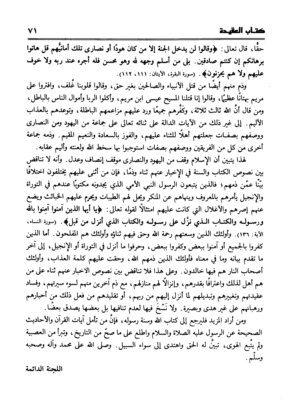 ومن أراد المزيد فليرجع إلى كتاب الله وسنة رسوله، فإنَّ من تأمل آيات القرآن والأحاديث الصحيحة عن الرسول عليه الصلاة والسلام واطلع على ما صحَّ من التاريخ، وتبرأ من العصبية ولم يتّبع الهوى، تبيّن له الحق واهتدى إلى سواء السبيل. وصلى الله على محمد وآله وصحبه وسلم.