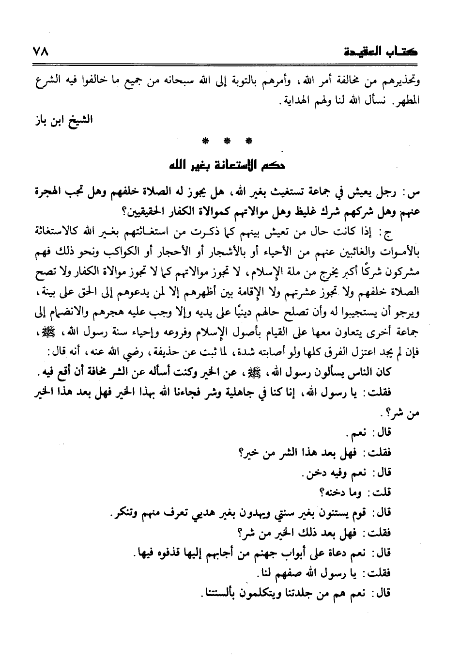 ج إذا كانت حال من تعيش بينهم - كما ذكرت من استغاثتهم بغير الله, كالاستغاثة بالأموات والغائبين عنهم من الأحياء أو بالأشجار أو الأحجار أو الكواكب ونحو ذلك - فهم مشركون شركا أكبر يخرج من ملة الإسلام , لا تجوز موالاتهم , كما لا تجوز موالاة الكفار , ولا تصح الصلاة خلفهم , ولا تجوز عشرتهم ولا الإقامة بين أظهرهم إلا لمن يدعوهم إلى الحق على بينة, ويرجو أن يستجيبوا له وأن تصلح حالهم دينيا على يديه , وإلا وجب عليه هجرهم والانضمام إلى جماعة أخرى يتعاون معها على القيام بأصول الإسلام وفروعه، وإحياء سنة رسول الله صلى الله عليه وسلم , فإن لم يجد اعتزل الفرق كلها ولو أصابته شدة ; لما ثبت عن حذيفة رضي الله عنه أنه قال كان الناس يسألون رسول الله صلى الله عليه وسلم عن الخير, وكنت أسأله عن الشر مخافة أن أقع فيه, فقلت يا رسول الله, إنا كنا في جاهلية وشر فجاءنا الله بهذا الخير, فهل بعد هذا الخير من شر؟ قال " نعم "، فقلت فهل بعد هذا الشر من خير؟ قال " نعم وفيه دخن "، قلت وما دخنه؟ قال " قوم يستنون بغير سنتي ويهدون بغير هديي تعرف منهم وتنكر "، فقلت فهل بعد ذلك الخير من شر؟ قال " نعم , دعاة على أبواب جهنم من أجابهم إليها قذفوه فيها "، فقلت يا رسول الله , صفهم لنا , قال " نعم , هم من جلدتنا, ويتكلمون بألسنتنا "،