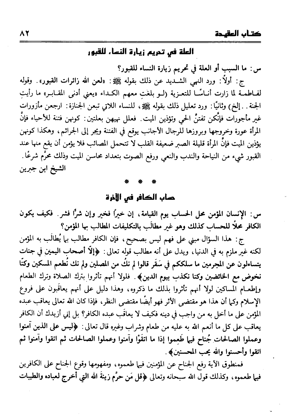 ج أولاً ورد النهي الشديد عن ذلك بقوله صلى الله عليه وسلم " لعن الله زائرات القبور". وقوله لفاطمة لما زارت أناساً للتعزية " لو بلغت معهم الكداء (يعني أدنى المقابر) ما رأيتِ الجنة.. إلخ ". وثانياً ورد تعليل ذلك بقوله صلى الله عليه وسلم للنساء اللاتي تبعن الجنازة " ارجعن مأزورات غير مأجورات فإنكن تفتن الحي وتؤذين الميت " فعلّل نهيهن بعلتين كونهن فتنة للأحياء فإن المرأة عورة وخروجها وبروزها للرجال الأجانب يوقع في الفتنة ويجر إلى الجرائم، وهكذا كونهن يؤذين الميت فإن المرأة قليلة الصبر ضعيفة القلب لا تتحمل المصائب فلا يؤمَن أن يقع منها عند القبور شيء من النياحة والندب والنعي ورفع الصوت بتعداد محاسن الميت وذلك محرم شرعاً الشيخ ابن جبرين