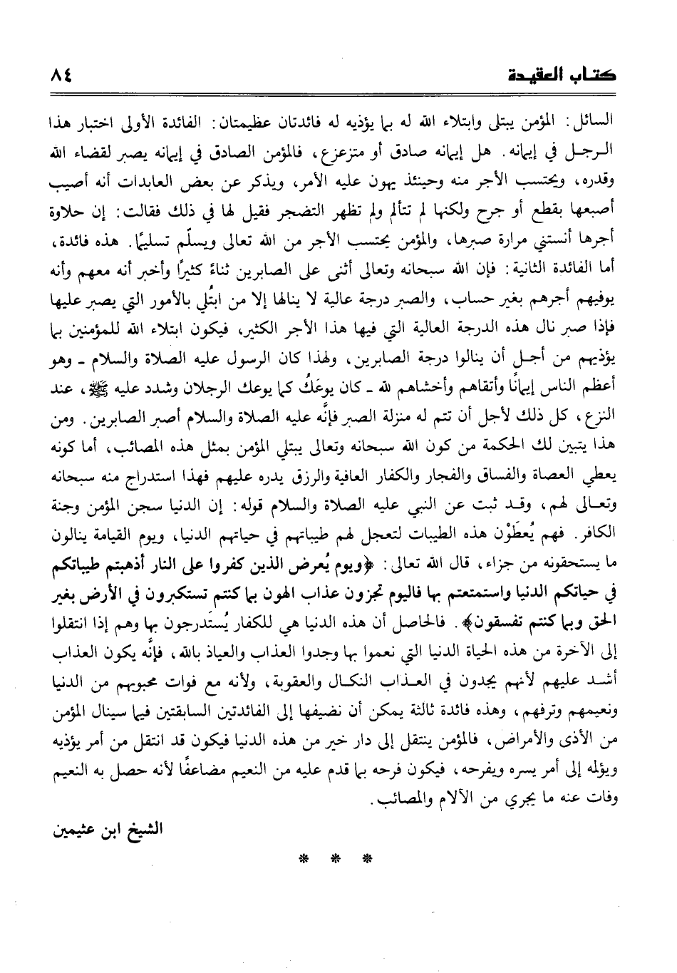 السائل المؤمن يبتلى وابتلاء الله له بما يؤذيه له فائدتان عظيمتان الفائدة الأولى اختبار هذا الرجل في إيمانه. هل إيمانه صادق أو متزعزع، فالمؤمن الصادق في إيمانه يصبر لقضاء الله وقدره، ويحتسب الأجر منه وحينئذ يهون عليه الأمر، ويذكر عن بعض العابدات أنه أصيب أصبعها بقطع أو جرح ولكنها لم تتألم ولم تظهر التضجر فقيل لها في ذلك فقالت إن حلاوة أجرها أنستني مرارة صبرها، والمؤمن يحتسب الأجر من الله تعالى ويسلم تسليماً. هذه فائدة. أما الفائدة الثانية فإن الله سبحانه أثنى على الصابرين ثناءً كبيراً وأخبر أنه معهم وأنه يوفيهم أجرهم بغير حساب، والصبر درجة عالية لا ينالها إلا من ابتُلي بالأمور التي يُصبر عليها فإذا صبر نال هذه الدرجة العالية التي فيها هذا الأجر الكثير، فيكون ابتلاء الله للمؤمنين بما يؤذيهم من أجل أن ينالوا درجة الصابرين، ولهذا كان الرسول عليه الصلاة والسلام وهو أعظم الناس إيماناً وأتقاهم لله وأخشاهم لله كان يوعك كما يوعك الرجلان وشُدد عليه صلى الله عليه وسلم عند النزع كل ذلك لأجل أن تتم له منزلة الصبر فإنه عليه الصلاة والسلام أصبر الصابرين، ومن هذا يتبين لك الحكمة من كون الله سبحانه وتعالى يبتلي المؤمن بمثل هذه المصائب، أما كونه يعطي العصاة والفساق والفجار والكفار العافية والرزق يدره عليهم فهذا استدراج منه سبحانه وتعالى لهم، وقد ثبت عن النبي صلى الله عليه وسلم قوله إن الدنيا سجن المؤمن وجنة الكافر. فهم يُعطون هذه الطيبات لتُعجل لهم طيباتهم في حياتهم الدنيا، ويوم القيامة ينالون ما يستحقونه من جزاء، قال الله تعالى {وَيَوْمَ يُعْرَضُ الَّذِينَ كَفَرُوا عَلَى النَّارِ أَذْهَبْتُمْ طَيِّبَاتِكُمْ فِي حَيَاتِكُمُ الدُّنْيَا وَاسْتَمْتَعْتُمْ بِهَا فَالْيَوْمَ تُجْزَوْنَ عَذَابَ الْهُونِ بِمَا كُنْتُمْ تَسْتَكْبِرُونَ فِي الْأَرْضِ بِغَيْرِ الْحَقِّ وَبِمَا كُنْتُمْ تَفْسُقُونَ} . فالحاصل أن هذه الدنيا هي للكفار يُستدرجون بها وهم إذا انتقلوا إلى الآخرة من هذه الحياة الدنيا التي نعموا بها وجدوا العذاب والعياذ بالله، فإنه يكون العذاب أشد عليهم لأنهم يجدون في العذاب النكال والعقوبة، ولأنه مع فوات محبوبهم من الدنيا ونعيمهم وترفهم، وهذه فائدة ثالثة يمكن أن نضيفها إلى الفائدتين السابقتين فيما سينال المؤمن من الأذى والأمراض، فالمؤمن ينتقل من دار خير من هذه الدنيا فيكون قد انتقل من أمر يؤذيه ويؤلمه إلى أمر يسره ويفرحه، فيكون فرحه بما قدم عليه من النعيم مضاعفاً لأنه حصل به النعيم وفات عنه ما يجري من الآلام والمصائب.
