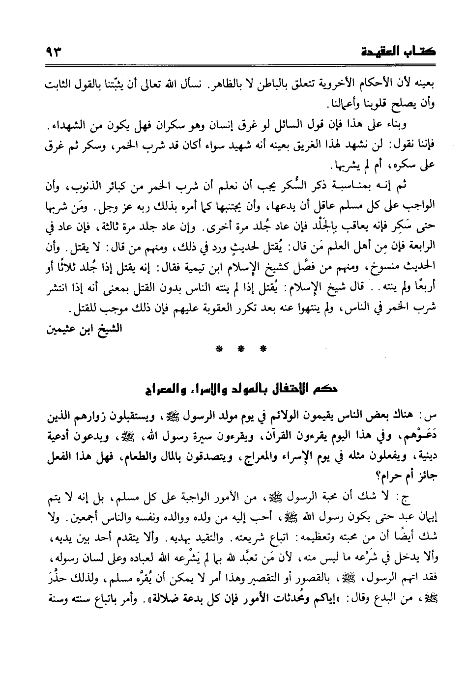 بعينه لأن الأحكام الأخروية تتعلق بالباطن لا بالظاهر. نسأل الله أن يثبتنا جميعاً بالقول الثابت وأن يصلح قلوبنا وأعمالنا. وبناء على هذا فإن قول السائل لو غرق الإنسان وهو سكران فهل يكون في الشهداء؟ فإننا نقول لن نشهد لهذا الغريق بعينه أنه شهيد سواء أكان قد شرب الخمر، وسكر ثم غرق على سكره أم لم يشربها. ثم إنه بمناسبة ذكر السكر يجب أن نعلم أن شرب الخمر من كبائر الذنوب وأن الواجب على كل مسلم عاقل أن يدعها، وأن يجتنبها كما أمره بذلك ربه عز وجل، ومن شربها حتى سكر فإنه يعاقب بالجلد، فإن عاد جلد مرة أخرى. وإن عاد جلد مرة ثالثة، فإن عاد في الرابعة فإن من أهل العلم من قال يقتل لحديث ورد