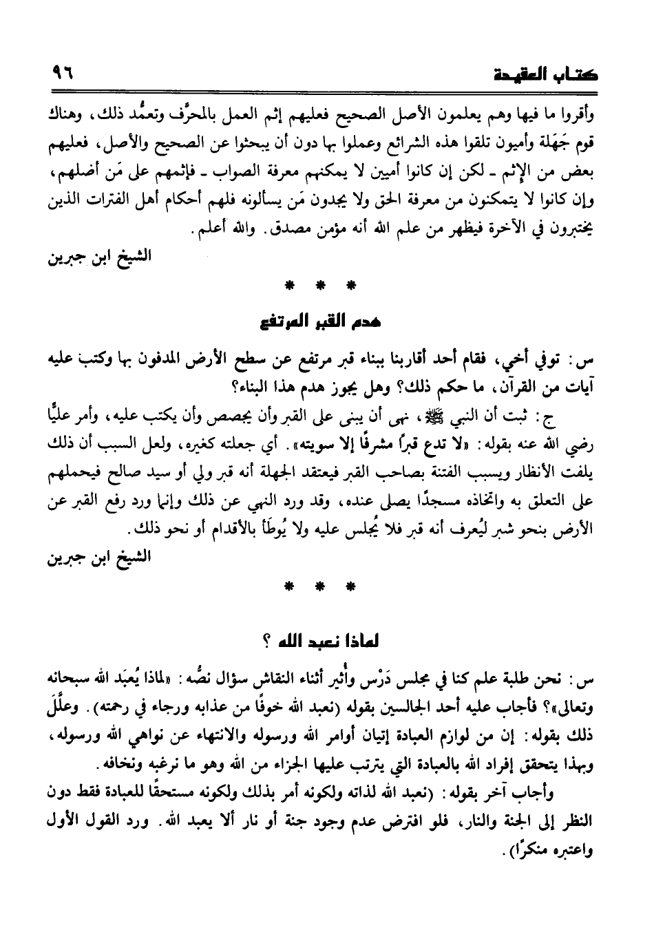 س نحن طلبة علم كنا في مجلس دَرس وأُثير النقاش سؤال ونصه " لماذا يُعبد الله سبحانه وتعالى "؟ فأجاب عليه أحد الجالسين بقوله (نعبد الله خوفاً من عذابه ورجاء في رحمته) . وعلّل ذلك بقوله إن من لوازم العبادة إتيان أوامر الله ورسوله والانتهاء عن نواهي الله ورسوله، وبهذا يتحقق إفراد الله بالعبادة التي يترتب عليها الجزاء من الله وهو ما نرغبه ونخافه. وأجاب آخر بقوله (نعبد الله لذاته ولكونه أمر بذلك ولكونه مستحقًّا للعبادة فقط دون النظر إلى الجنة والنار، فلو افترض عدم وجود جنة أو نار ألا يعبد الله. ورد القول الأول واعتبره منكرًا) .