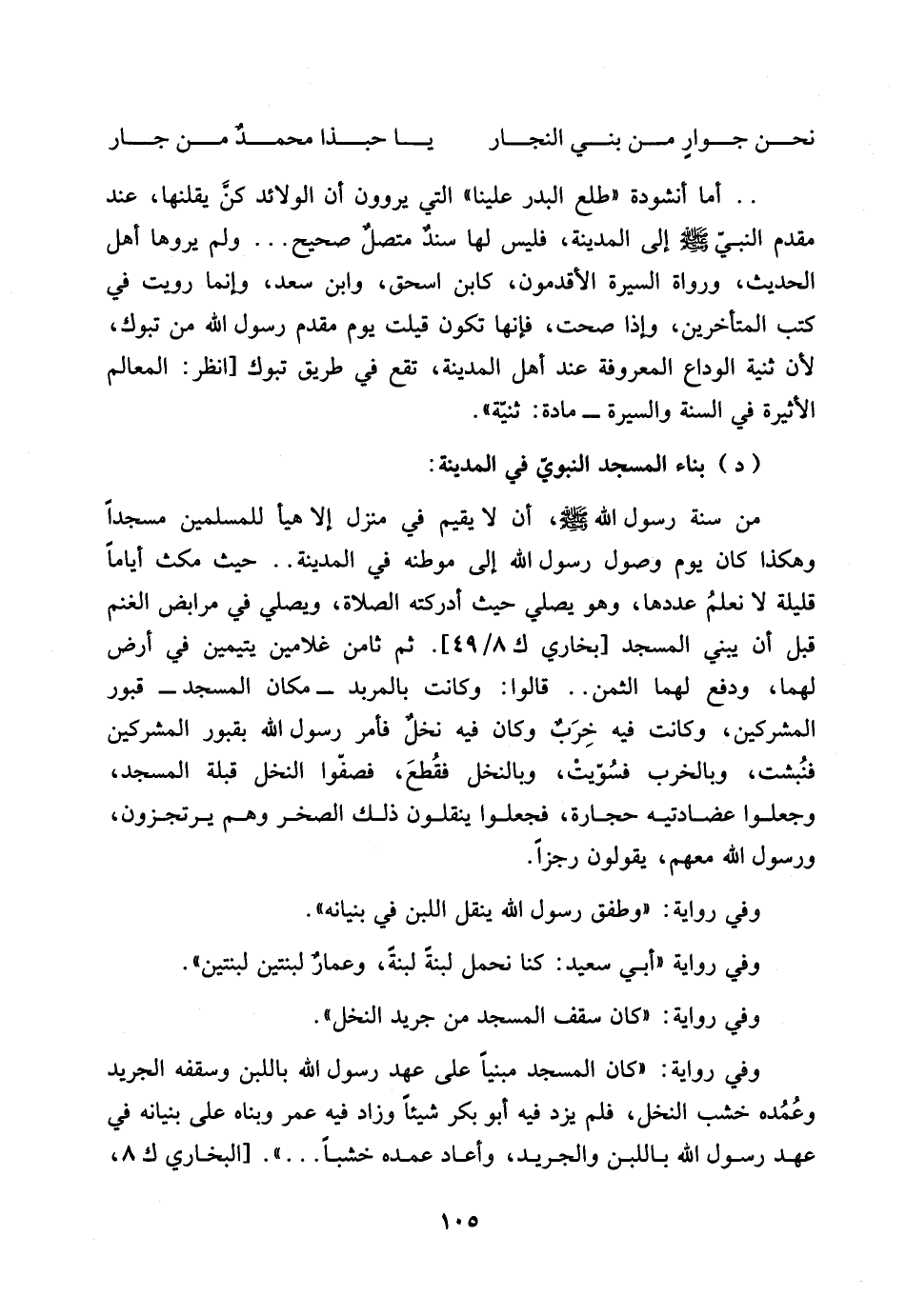 .. اما انشودة ((طلع البدر علينا)) التي يروون ان الولائد كن يقلنها، عند مقدم النبي صلى الله عليه وسلم إلى المدينة، فليس لها سند متصل صحيح ... ولم يروها أهل الحديث، ورواة السيرة الأقدمون، كابن اسحق، وابن سعد، وإنما رويت في كتب المتأخرين، وإذا صحت، فإنها تكون قيلت يوم مقدم رسول الله من تبوك، لأن ثنية الوداع المعروفة عند أهل المدينة، تقع في طريق تبوك [انظر: المعالم الأثيرة في السنة والسيرة ـ مادة: ثنية)).