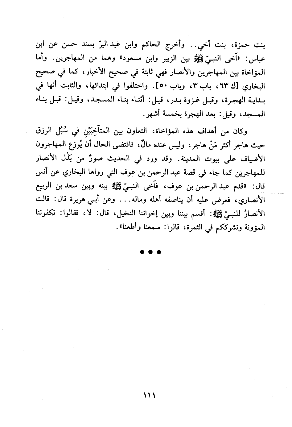111…بنت حمزة، بنت أخي .. وأخرج الحاكم وابن عبد البر حسن عن ابن عباس: ((آخى النبي صلى الله عليه وسلم بين الزبير وابن مسعود وهما من المهاجرين. وأما المؤاخاة بين المهاجرين والأنصار فهي ثابتة في صحيح الأخبار، كما في صحيح البخاري [ك 63، باب 3، وباب 50]. واختلفوا في ابتدائها، والثابت أنها في بداية الهجرة، وقبل غزوة بدر، قيل: اثناء بناء المسجد وقيل: قبل بناء المسجد، وقيل: بعد الهجرة بخمسة أشهر.
