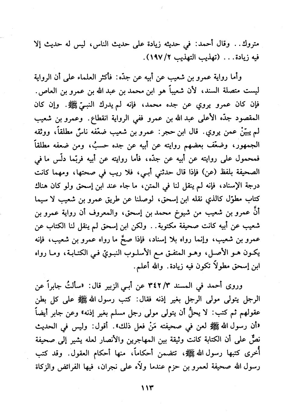 وأما رواية عمرو بن شعيب عن أبيه عن جده: فأكثر العلماء على أن الرواية ليست متصلة السند، لأن شعيباً هو ابن محمد بن عبد الله بن عمرو بن العاص.