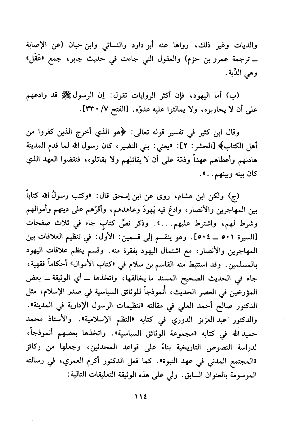 والاستاذ محمد حميد الله في كتابه ((مجموعة الوثائق السياسية)). واتخذها بعضهم أنموذجاً، لدراسة النصوص التاريخية بناءً على قواعد المحدثين، وجعلها من ركائز ((المجتمع المدني في عهد النبوة)). كما فعل الدكتور أكرم العمري، في رسالته الموسومة بالعنوان السابق. ولي على هذه الوثيقة التعليقات التالية:…