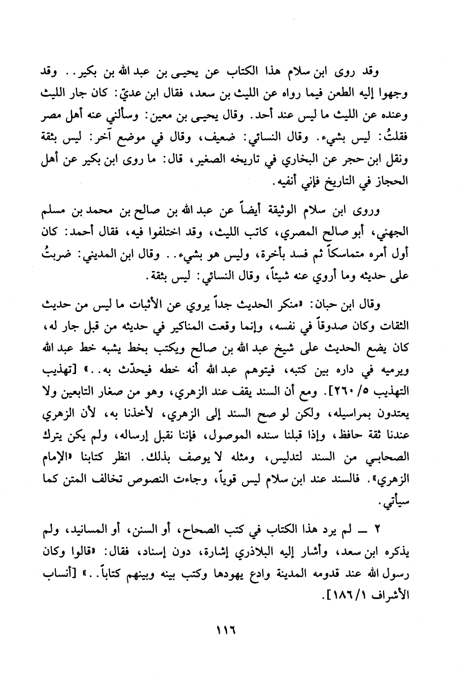116…وقد روى ابن سلام هذا الكتاب عن يحيى بن عبد الله بن بكير .. وقد وجهوا إليه الطعن فيما رواه عن الليث بن سعد، فقال ابن عدي: كان جار الليث وعنده عن الليث ماليس عند أحد.