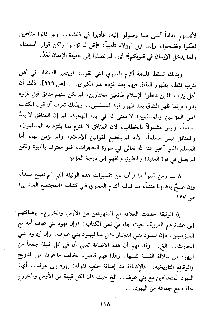 8 - ومن أسوأ ما قرأت من تفسيرات هذه الوثيقة التي لم تصح سنداً، وان صح بعضها متناً، ما قاله أكرم العمري في كتابه ((المجتمع المدني)) ص 127: إن الوثيقة حددت العلاقة مع المتهودين من الأوس والخزرج، بإضافتهم إلى عشائرهم العربية، حيث جاء في نص الكتاب: ((وإن يهود بني عوف أمة مع المؤمنين. وان ليهود بني النجار مثل ما ليهود بني عوف، وان ليهود بني الحارث .. الخ .. وقد فهم أن هذه الاضافة تعني أن في كل قبيلة جمعاً من اليهود من سلالة القبيلة نفسها. وهذا فهم قاصر، يخالف ما عرفنا من التاريخ والوقائع التاريخية .. فالإضافة هنا اضافة حلف فقوله: يهود بني عوف .. أي: اليهود المتحالفين مع بني عوف .. الخ حيث كان لكل قبيلة من الأوس والخزرج حلف مع جماعة من اليهود ... …