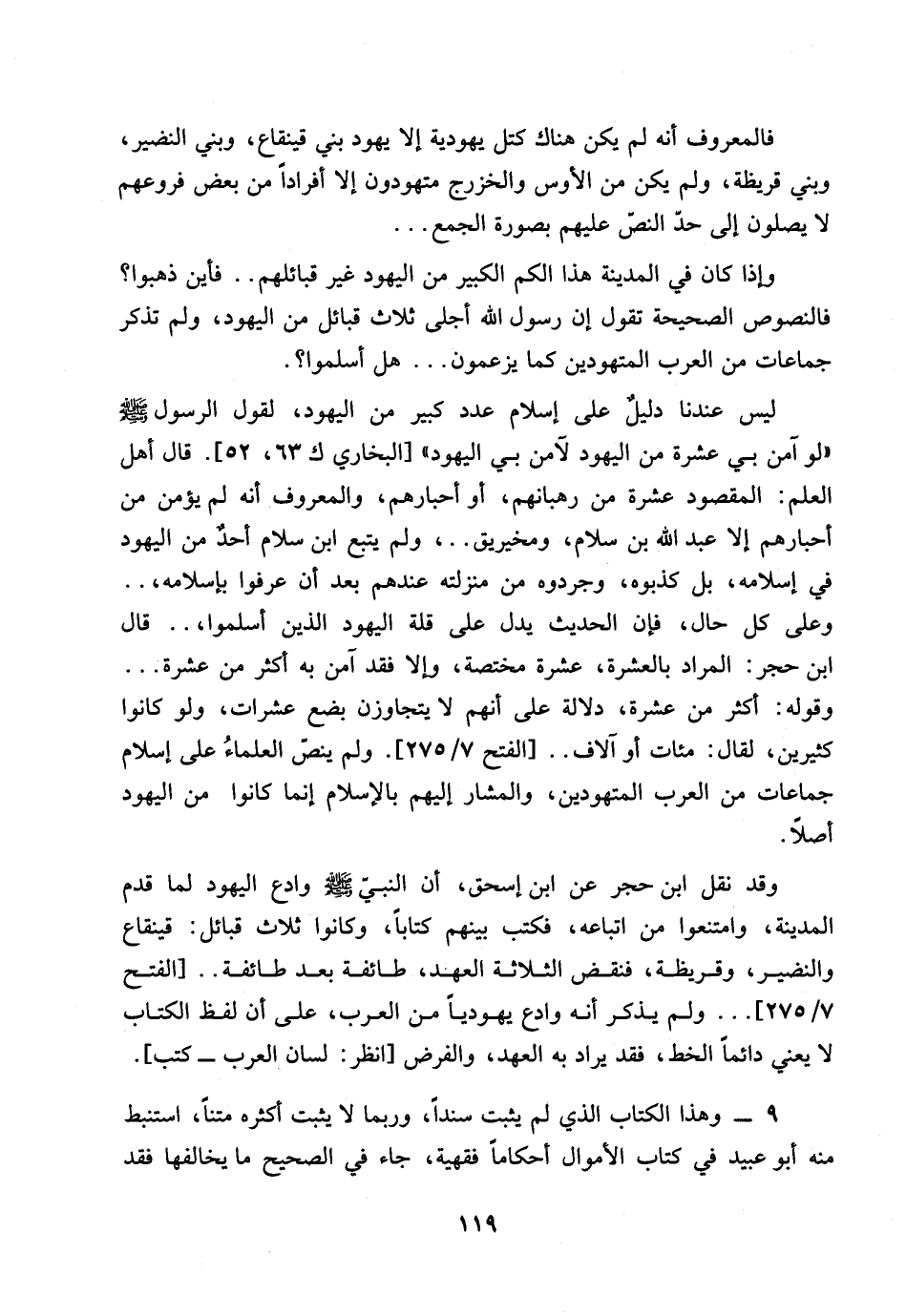 119…فالمعروف أنه لم يكن هناك كتل يهودية الإ يهود بني قينقاع، وبني النضير، وبني قريظة، ولم يكن من الأوس والخزرج متهودون إلا افراداً من بعض فروعهم لا يصلون إلى حد النص عليهم بصورة الجمع ... وإذا كان في المدينة هذا الكم الكبير من اليهود غير قبائلهم .. فأين ذهبوا؟ فالنصوص الصحيحة تقول أن رسول الله أجلى ثلاث قبائل من اليهود، ولم تذكر جماعات من العرب المتهودين كما يزعمون ... هل أسلموا؟.