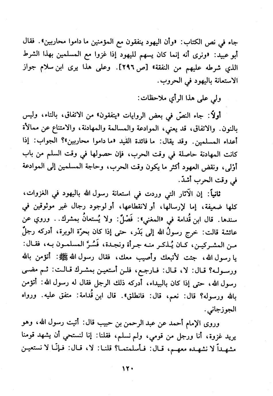 120…جاء في نص الكتاب: ((وأن اليهود ينفقون مع المؤمنين ما داموا محاربين)). فقال أبو عبيد: ((ونرى أنه إنما كان يسهم لليهود إذا غزوا مع المسلمين بهذا الشرط الذي شرطه عليهم من النفقة)) [ص 296]. وعلى هذا يرى ابن سلام جواز الاستعانة باليهود في الحروب.