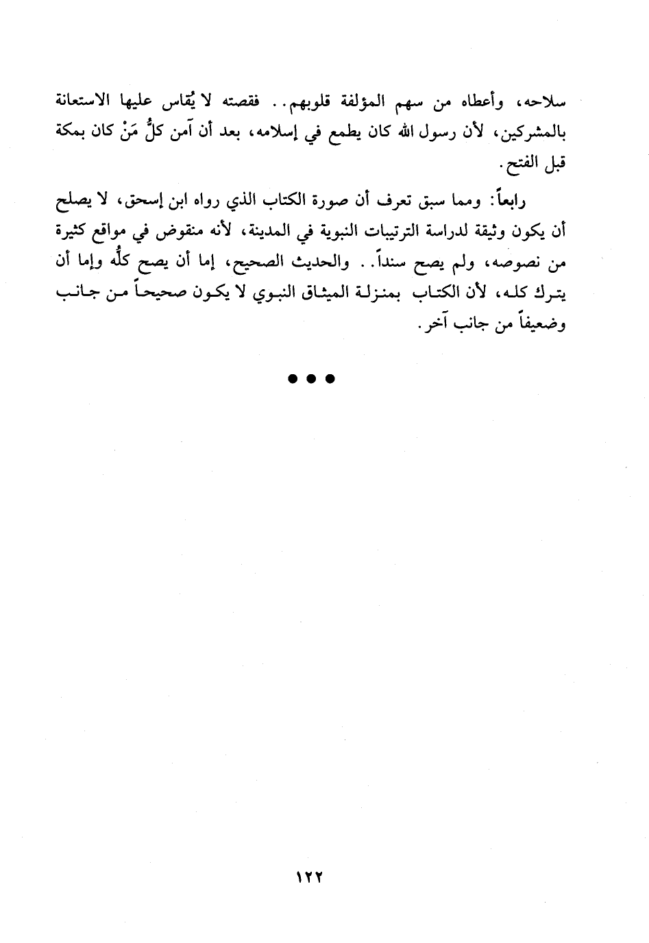 رابعاً: ومما سبق تعرف أن صورة الكتاب الذي رواه ابن اسحق، لايصلح أن يكون وثيقة لدراسة الترتيبات النبوية في المدينة، لأنه منقوض في مواقع كثيرة من نصوصه، ولم يصح سنداً .. والحديث الصحيح، إما أن يصح كله وإما أن يترك كله، لأن الكتاب بمنزلة الميثاق النبوي لا يكون صحيحاً من جانب وضعيفاً من جانب آخر.