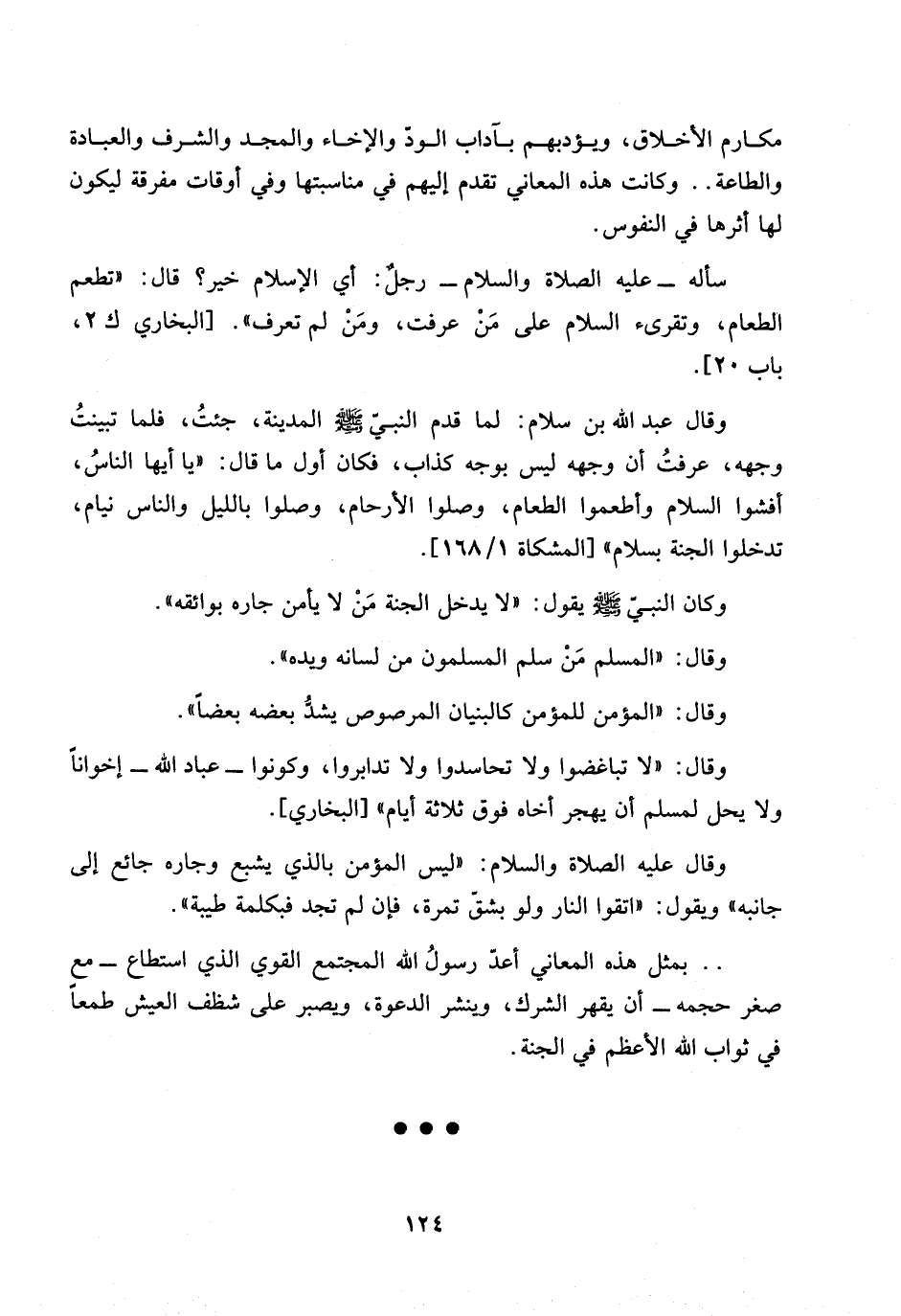 و قال عبد الله بن سلام: لما قدم النبي صلى الله عليه وسلم المدينة، جئت، فلما تبينت وجهه، عرفت أن وجهه ليس بوجه كذاب، فكان أول ما قال: ((يا أيها الناس، افشوا السلام واطعموا الطعام، وصلوا الأرحام، وصلوا بالليل والناس نيام، تدخل الجنة بسلام)) [المشكاة 168/ 1].
