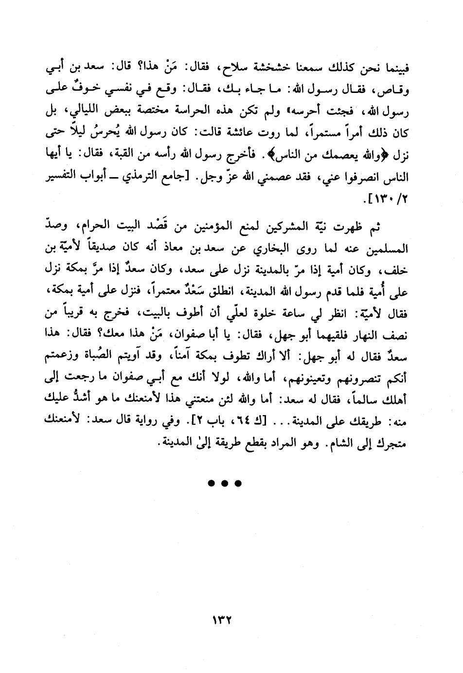 132…فبينما نحن كذلك سمعنا خشخشة سلاح، فقال: من هذا؟ قال: سعد بن أبي وقاص، فقال رسول الله: ماجاء بك، فقال: وقع في نفسي خوف على رسول الله، فجئت أحرسه)) ولم تكن هذه الحراسة مختصة ببعض الليالي، بل كان ذلك أمراً مستمراً، لما روت عائشة قالت: كان رسول الله يحرس ليلاً حتى نزل (والله يعصمك من الناس).