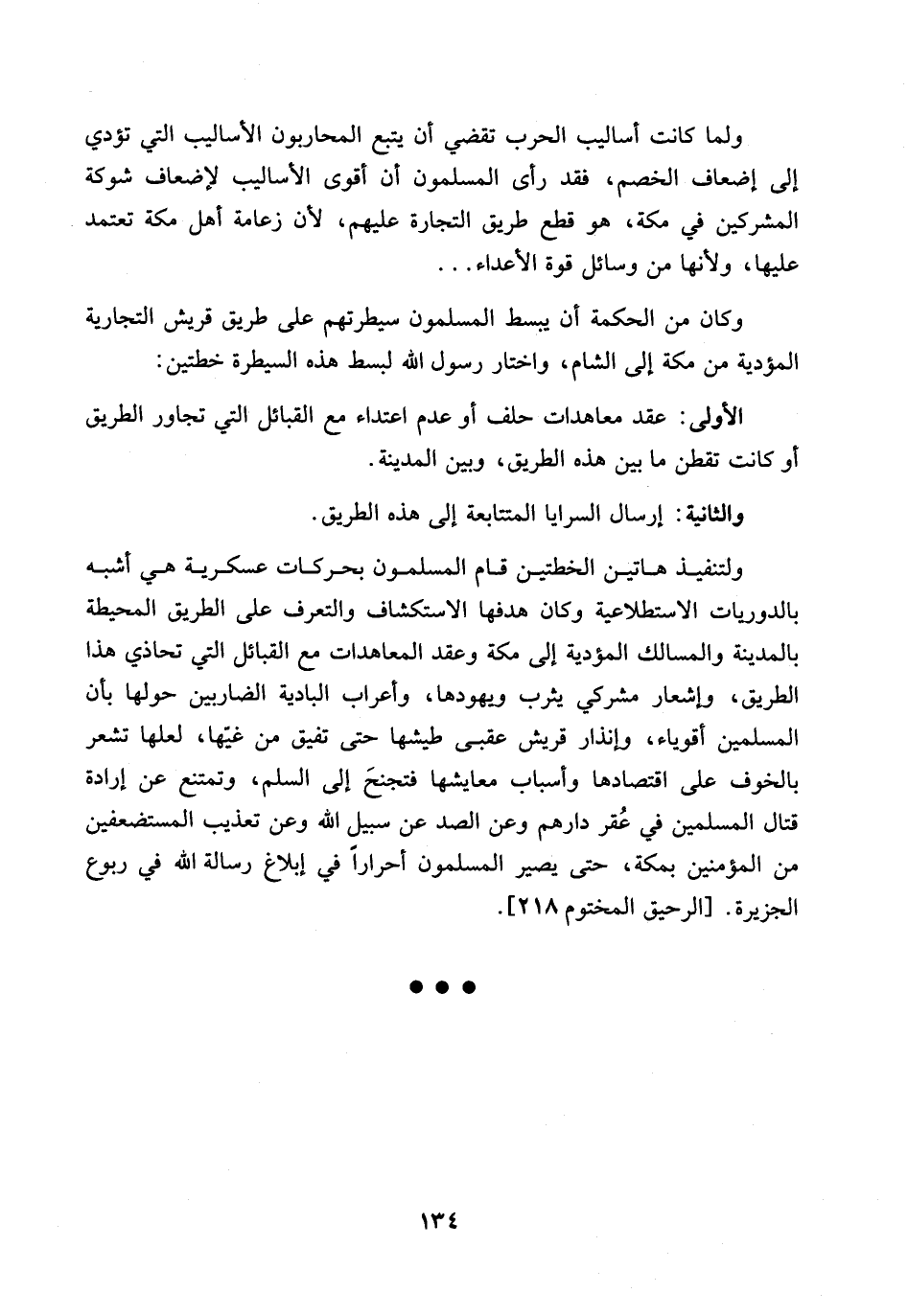 134…ولما كانت أساليب الحرب تقضي أن يتبع المحاربون الأساليب التي تؤدي إلى اضعاف الخصم، فقد رأى المسلمون أن أقوى الأساليب لإضعاف شوكة المشركين في مكة، هو قطع طريق التجارة عليهم، لأن زعامة أهل مكة تعتمد عليها، ولأنها من وسائل قوة الأعداء ... وكان من الحكمة أن يبسط المسلمون سيطرتهم على طريق قريش التجارية المؤدية من مكة إلى الشام، واختار رسول الله لبسط هذه السيطرة خطتين: