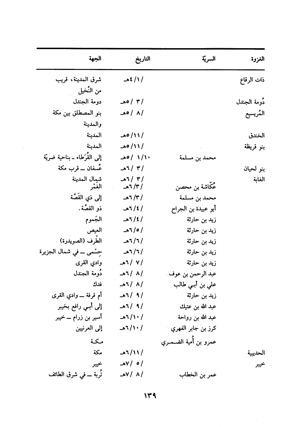 بنو قريظة /5/ 11 هـ المدينة محمد بن سلمة 5/ 1/10 هـ إلى القرطاء ـ بناحية ضرية