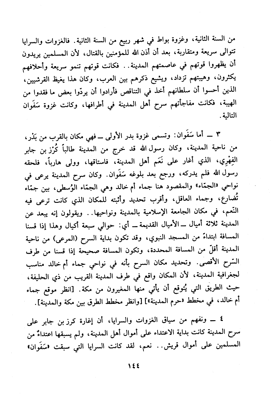 من السنة الثانية، وغزوة بواط في شهر ربيع من السنة الثانية. فالغزوات والسرايا تتوالى سريعة ومتقاربة، بعد أن أذن الله للمؤمنين بالقتال، لأن المسلمين يريدون أن يظهروا قوتهم في عاصمتهم المدينة .. فكانت قوتهم تنمو سريعة وأحلافهم يكثرون، وهيبتهم تزداد، ويشيع ذكرهم بين العرب، وكان هذا يغيظ القرشيين، الذين أحسوا أن سلطانهم أخذ في التناقص فأرادوا أن يردوا بعض ما فقدوا من الهيبة، فكانت مفاجأتهم سرح أهل المدينة في أطرافها، وكانت غزوة سفوان التالية: