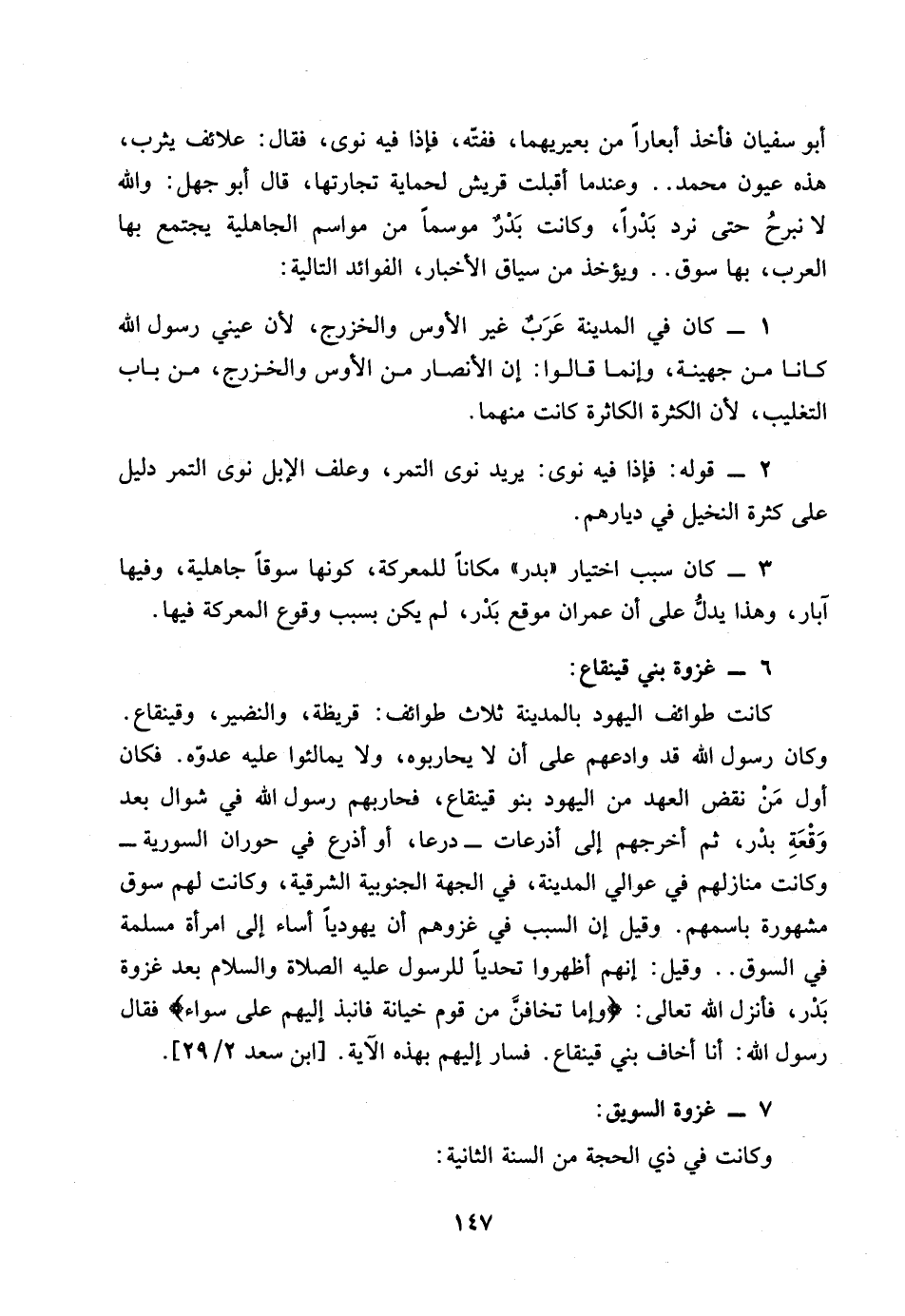 أبو سفيان فأخذ أبعارا من بعيريهما، ففته، فإذا فيه نوى، فقال: علائف يثرب، هذه عيون محمد .. وعندما أقبلت قريش لحماية تجارتها، قال أبو جهل: والله لا نبرح حتى نرد بدرا، وكانت بدر موسما من مواسم الجاهلية يجتمع بها العرب، بها سوق .. ويؤخذ من سياق الأخبار، الفوائد التالية: