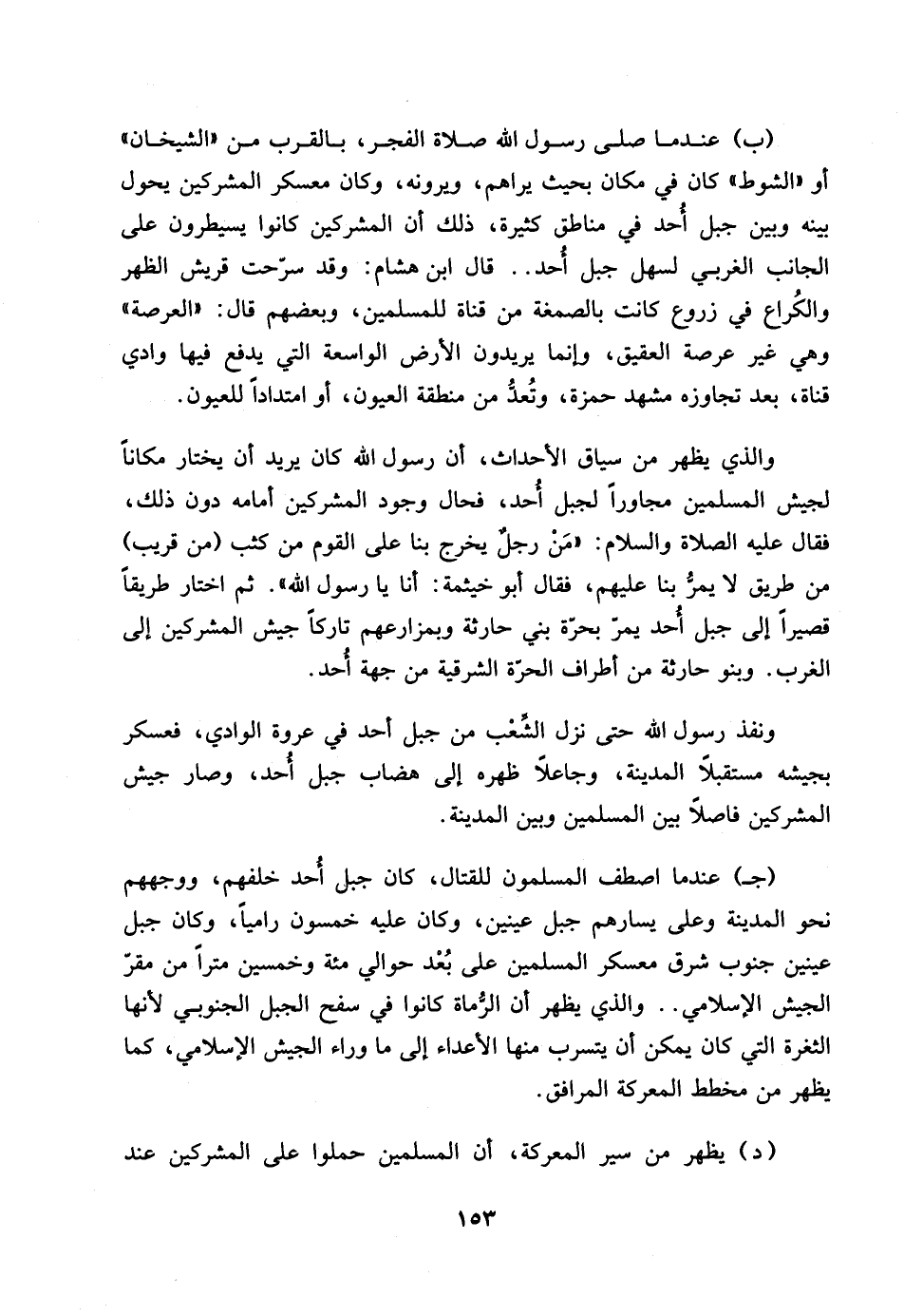 (ب) عندما صلى رسول الله صلاة الفجر، بالقرب من ((الشيخان)) أو ((الشوط)) كان في مكان بحيث يراهم ويرونه، وكان معسكر المشركين يحول بينه وبين جبل احد في مناطق كثيرة، ذلك أن المشركين كانوا يسيطرون على الجانب الغربي لسهل جبل احد .. قال ابن هشام: وقد سرحت قريش الظهر والكراع في زروع كانت بالصمغة من قناة للمسلمين، وبعضهم قال: ((العرصة)) وهي غير عرصة العقيق، وإنما يريدون الارض الواسعة التي يدفع فيها وادي قناة، بعد تجاوزه مشهد حمزة، وتعد من منطقة العيون، أو امتداداً للعيون.