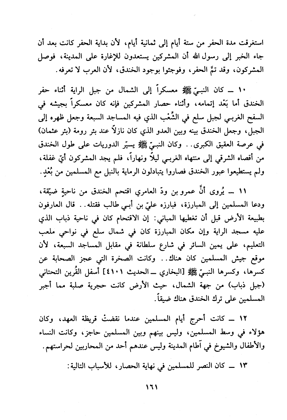 161…استغرقت مدة الحفر ستة أيام إلى ثمانية أيام، لأن بداية الحفر كانت بعد أن جاء الخبر إلى رسول الله أن المشركين يستعدون للإغارة على المدينة، فوصل المشركون، وقد تم الحفر، وفوجئوا بوجود الخندق، لأن العرب لاتعرفه.