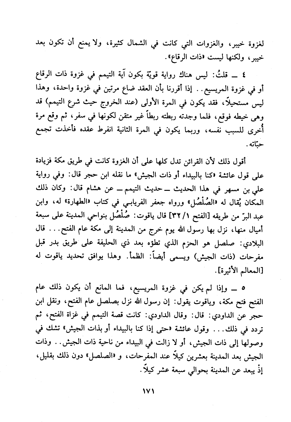 5 ـ وإذا لم يكن قي غزوة المريسيع، فما المانع أن يكون ذلك عام الفتح فتح مكة، وياقوت يقول: إن رسول الله نزل بصلصل عام الفتح، ونقل ابن حجر عن الداودي: قال: وقال الداودي: كانت قصة التيمم في غزاة الفتح، ثم تردد في ذلك ... وقول عائشة ((حتى إذا كنا بالبيداء أو بذات الجيش)) تشك في وصولها إلى ذات الجيش، أولا زالت في البيداء من ناحية ذات الجيش .. وذات الجيش بعد المدينة بعشرين كيلا عند المفرحات، و ((الصلصل)) دون ذلك بقليل، إذ يبعد عن المدينة بحوالي سبعة عشر كيلا.