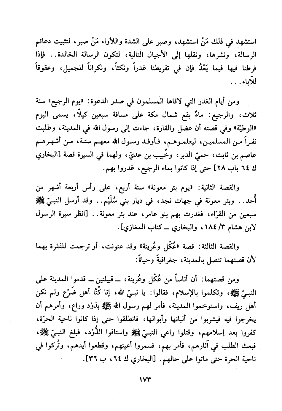 استشهد في ذلك من استشهد، وصبر على الشدة واللأواء من صبر، لتثبيت دعائم الرسالة، ونشرها، ونقلها إلى الأجيال التالية، لتكون الرسالة الخالدة .. فإذا فرطنا فيها فيما بعد فإن في تفريطنا غدرا ونكثا، ونكرانا للجميل، وعقوقا للآباء ... ومن أيام الغدر التي لاقاها المسلمون في صدر الدعوة: ((يوم الرجيع)) سنة ثلاث، والرجيع: ماء يقع شمال مكة على مسافة سبعين كيلا، يسمى اليوم ((الوطية)) وفي قصته أن عضل والقارة، جاءت إلى رسول الله في المدينة، وطلبت نفرا من المسلمين، ليعلموهم، فأوفد رسول الله معهم ستة، من أشهرهم عاصم بن ثابت، حميّ البر، وخبيب بن عدي، ولهما في السيرة قصة [البخاري ك 64 باب 28] حتى إذا كانوا بماء الرجيع، غدروا بهم.