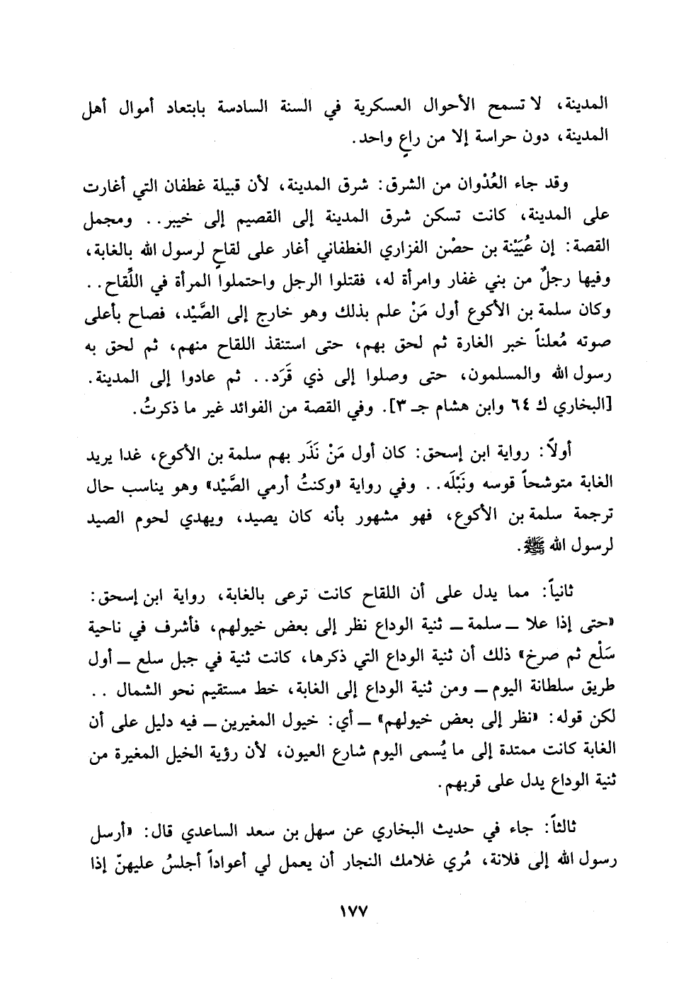 ثانياً: مما يدل على أن اللقاح كانت ترعى بالغابة، رواية ابن إسحق: ((حتى إذا علا ـ سلمة ـ ثنية الوداع نظر إلى بعض خيولهم، فأشرف في ناحية سلع ثم صرخ)) ذلك أن ثنية الوداع التي ذكرها، كانت ثنية في جبل سلع ـ أول طريق سلطانة اليوم ـ ومن ثنية الوداع إلى الغابة، خط مستقيم نحو الشمال .. لكن قوله: ((نظر إلى بعض خيولهم)) ـ أي: خيول المغيرين ـ فيه دليل على أن الغابة كانت ممتدة إلى ما يسمى اليوم شارع العيون، لأن رؤية الخيل المغيرة من ثنية الوداع يدل على قربهم.