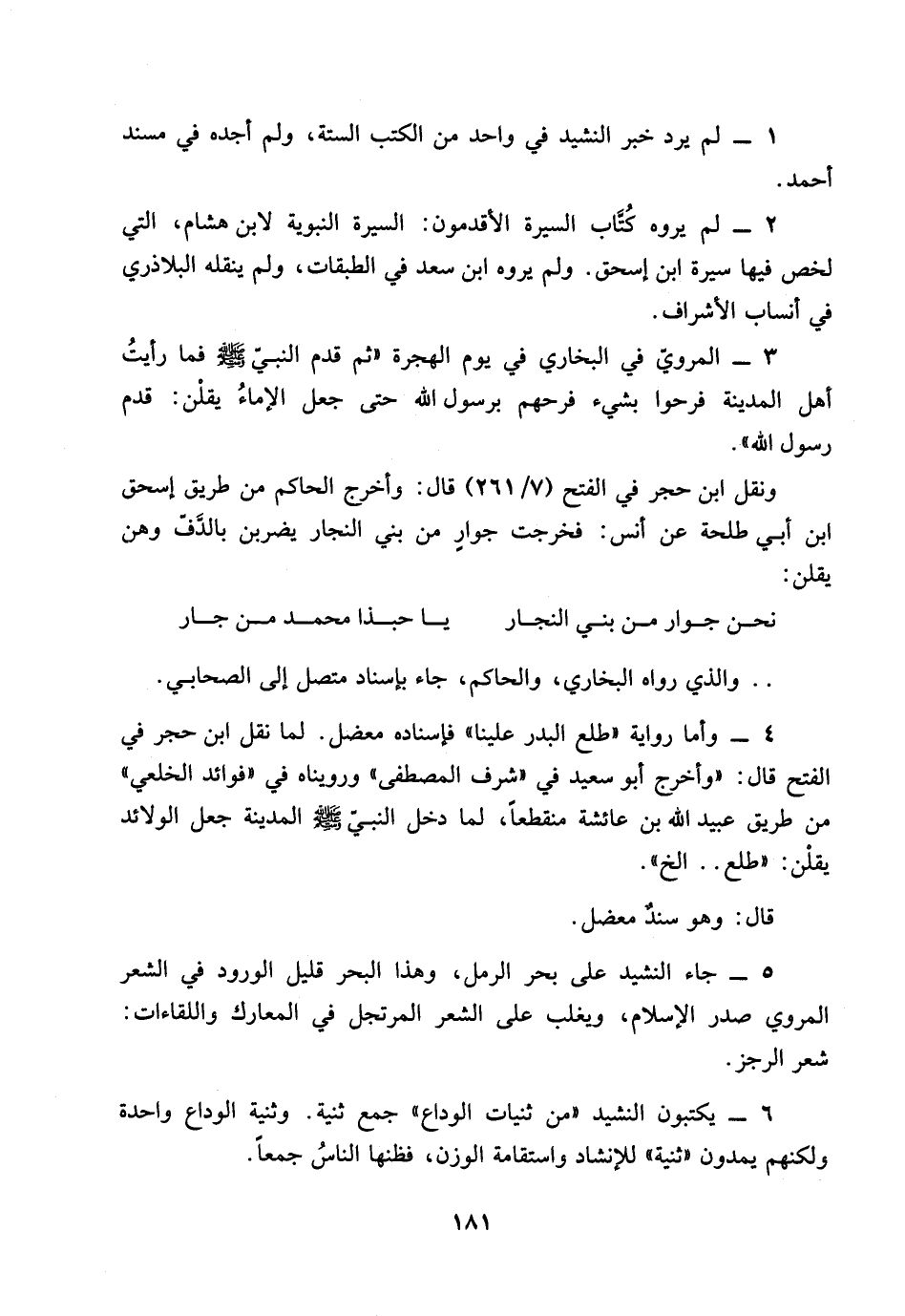 ونقل ابن حجر في الفتح (7/ 261) قال: وأخرج الحاكم من طريق اسحق ابن أبي طلحة عن أنس: فخرجت جوار من بني النجار يضربن بالدف وهن يقلن: نحن جوار من بني النجار ياحبذا محمد من جار .. والذي رواه البخاري، والحاكم، جاء بإسناد متصل إلى الصحابي.