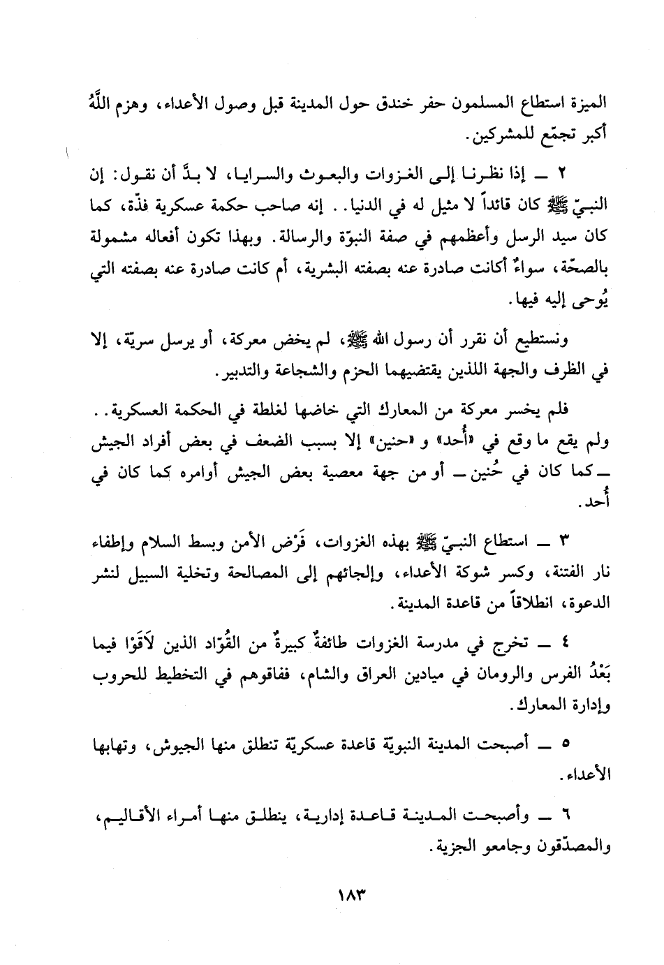 2 ـ اذا نظرنا الى الغزوات والبعوث والسرايا، لابد ان نقول: ان النبي صلى الله عليه وسلم كان قائداً لامثيل له في الدنيا .. انه صاحب حكمة عسكرية فذة، كما كان سيد الرسل وأعظمهم في صفة النبوة والرسالة.