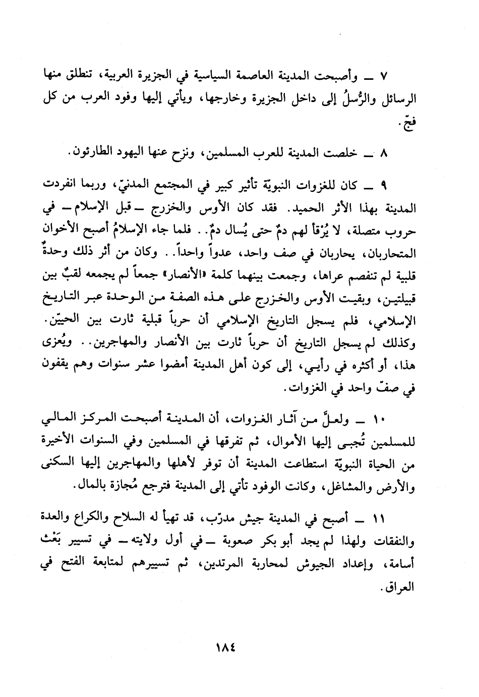 7 ـ واصبحت المدينة العاصمة السياسية في الجزيرة العربية، تنطلق منها الرسائل والرسل الى داخل الجزيرة وخارجها، ويأتي اليها وفود العرب من كل فج.