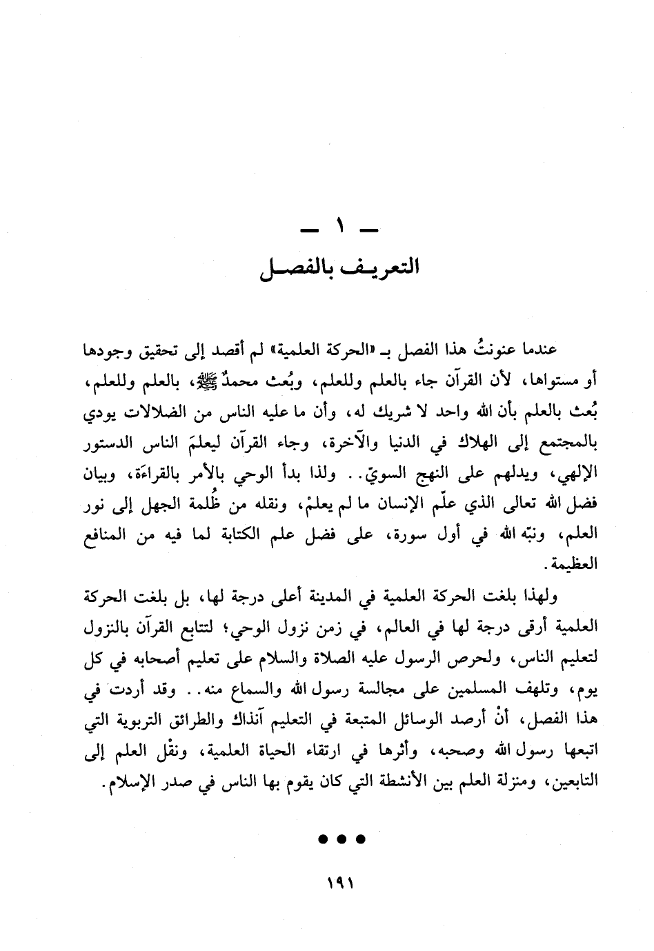 ولهذا بلغت الحركة العلمية في المدينة اعلى درجة لها، بل بلغت الحركة العلمية ارقى درجة لها في العالم، في زمن نزول الوحي؛ لتتابع القرآن بالنزول لتعليم الناس، ولحرص الرسول عليه الصلاة والسلام على تعليم اصحابه في كل يوم، وتلهف المسلمين على مجالسة رسول الله والسماع منه .. وقد اردت في هذا الفصل، ان ارصد الوسائل المتبعة في التعليم انذاك والطرائق التربوية التي اتبعها رسول الله وصحبه، واثرها في ارتقاء الحياة العلمية، ونقل العلم الى التابعين، ومنزلة العلم بين الانشطة التي كان يقوم بها الناس في صدر الإسلام.