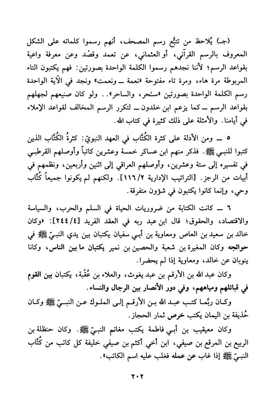 6 - كانت الكتابة من ضروريات الحرب في السلم والحرب، والسياسة والاقتصاد، والحقوق؛ قال ابن عبد ربه في العقد الفريد [244/ 4]: ((وكان خالد بن سعيد بن العاص ومعاوية بن أبي سفيان يكتبان بين يدي النبي صلى الله عليه وسلم في حوائجه وكان المغيرة بن شعبة والحصين بن نمير يكتبان مابين الناس، وكانا ينوبان عن خالد، ومعاوية إذا لم يحضرا.