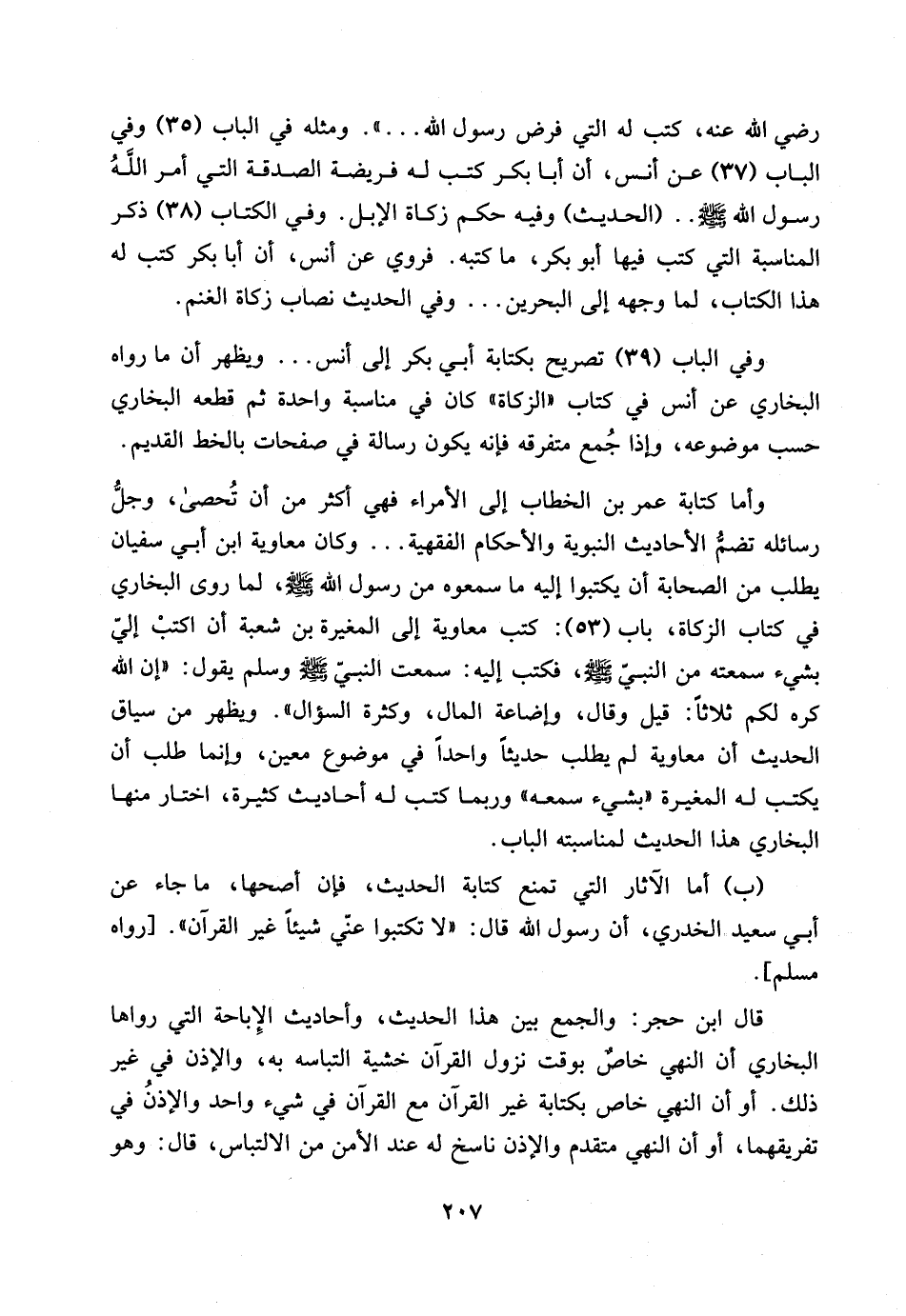 (ب) أما الآثار التي تمنع كتابة الحديث، فإن أصحها، ما جاء عن أبي سعيد الخدري، أن رسول الله قال: ((لا تكتبوا عني شيئاً غير القرآن)). [رواه مسلم].