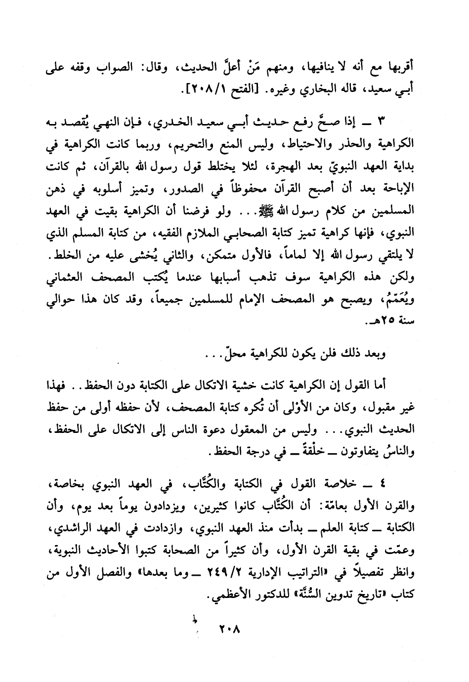 3 ـ إذا صح رفع حديث أبي سعيد الخدري، فإن النهي يقصد به الكراهية والحذر والاحتياط، وليس المنع والتحريم، وربما كانت الكراهية في بداية العهد النبوي بعد الهجرة، لئلا يختلط قول رسول الله بالقرآن، ثم كانت الإباحة بعد أن أصبح القرآن محفوظاً في الصدور، وتميز اسلوبه في ذهن المسلمين من كلام رسول الله صلى الله عليه وسلم ... ولو فرضنا أن الكراهية بقيت في العهد النبوي، فإنها كراهية تميز كتابة الصحابي الملازم الفقيه، من كتابة المسلم الذي لا يلتقي رسول الله إلا لماماً، فالأول متمكن، والثاني يخشى عليه من الخلط.