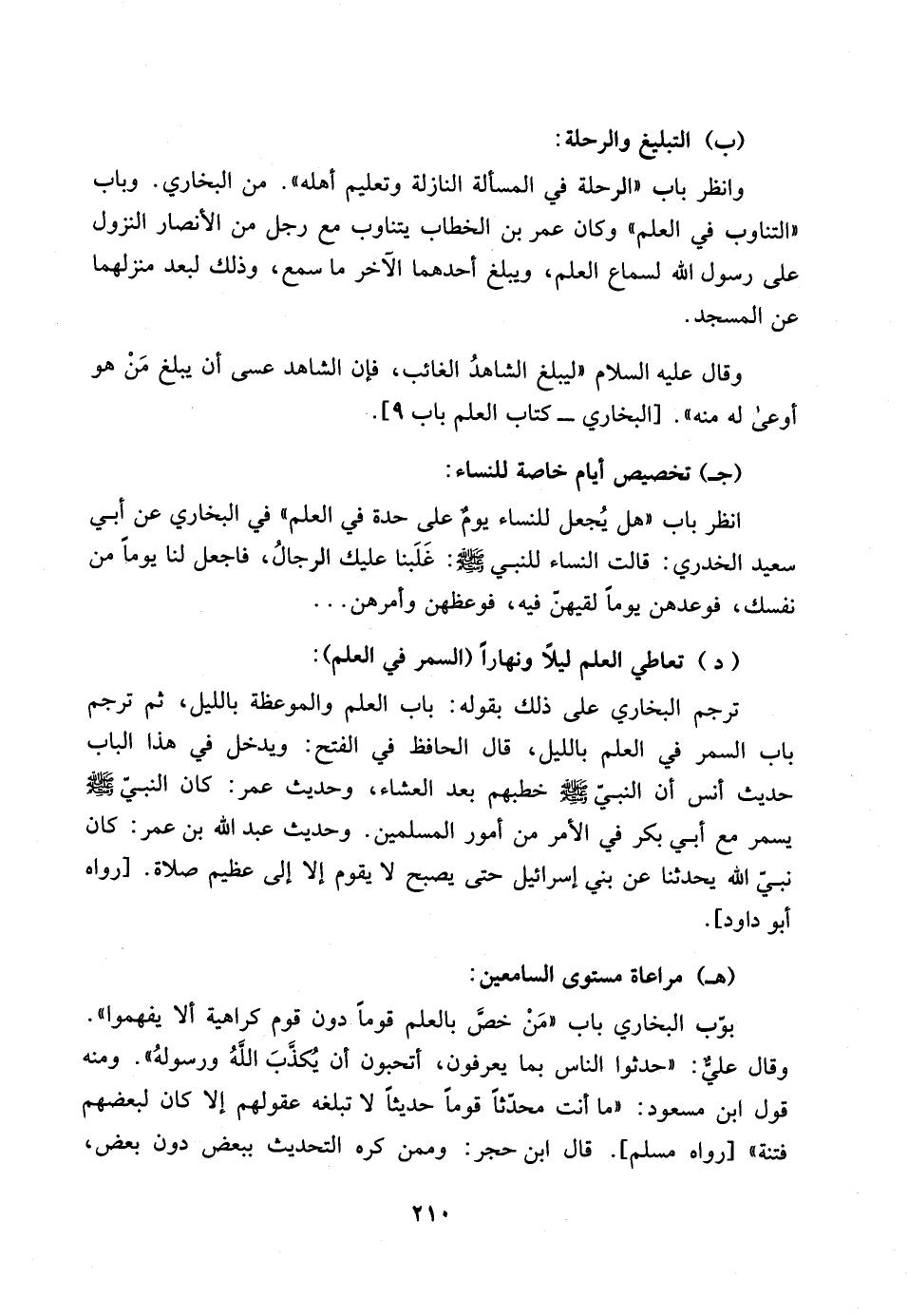 وانظر باب ((الرحلة في المسألة النازلة وتعليم أهله)). من البخاري. وباب ((التناوب في العلم)) وكان عمر بن الخطاب يتناوب مع رجل من الأنصار النزول على رسول الله لسماع العلم، ويبلغ أحدهما الآخر ما سمع، وذلك لبعد منزلهما عن المسجد.