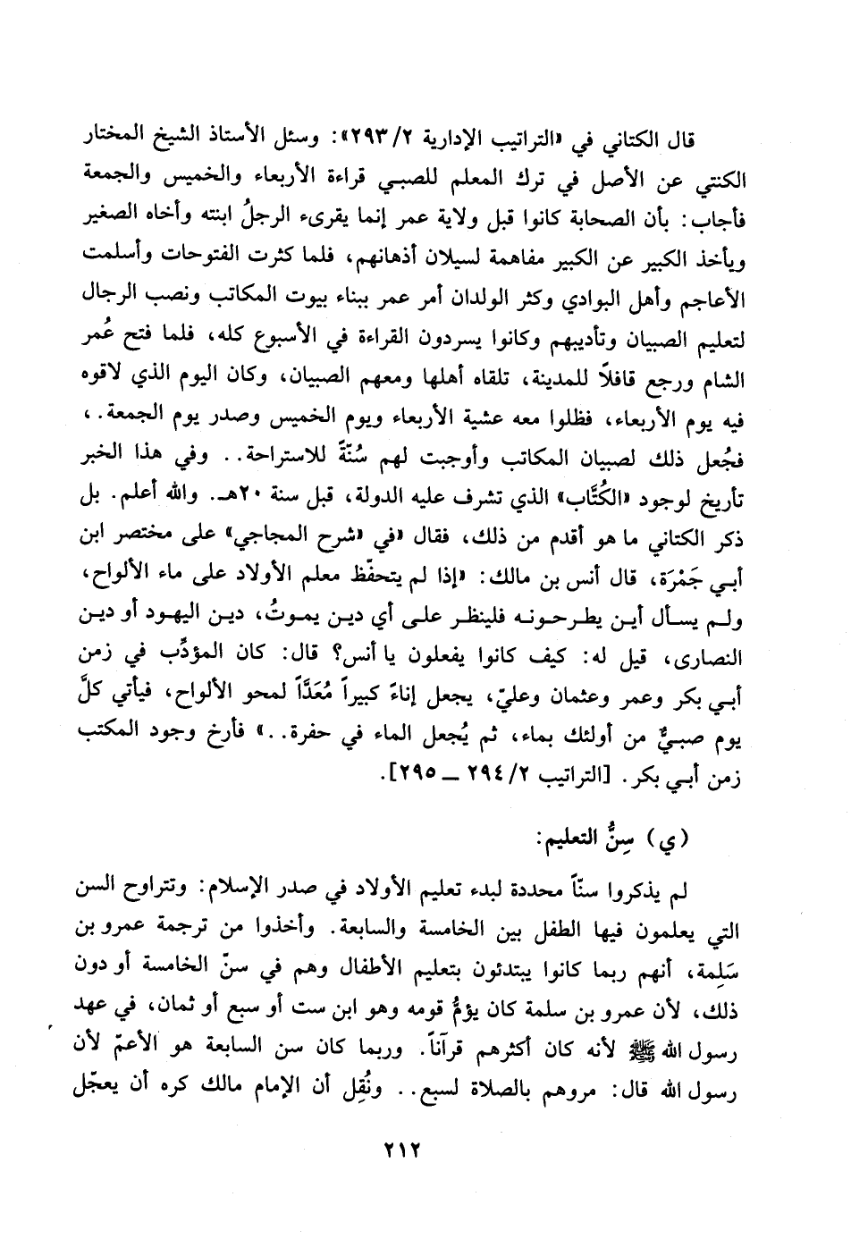 بل ذكر الكتاني ما هو أقدم من ذلك، فقال ((في شرح المجاجي)) على مختصر ابن أبي جمرة، قال أنس بن مالك: ((إذا لم يتحفظ معلم الأولاد على ماء الألواح، ولم يسأل أين يطرحونه فلينظر على أي دين يموت، دين اليهود أو دين النصارى، قيل له: كيف كانوا يفعلون يا أنس؟ قال: كان المؤدب في زمن أبي بكر وعمر وعثمان وعلي، يجعل إناء كبير معداً لمحو الالواح، فيأتي كل يوم صبي من اولئك بماء، ثم يجعل الماء في حفرة .. )) فأرخ وجود المكتب زمن أبي بكر. [التراتيب 294/ 2 ـ 295].