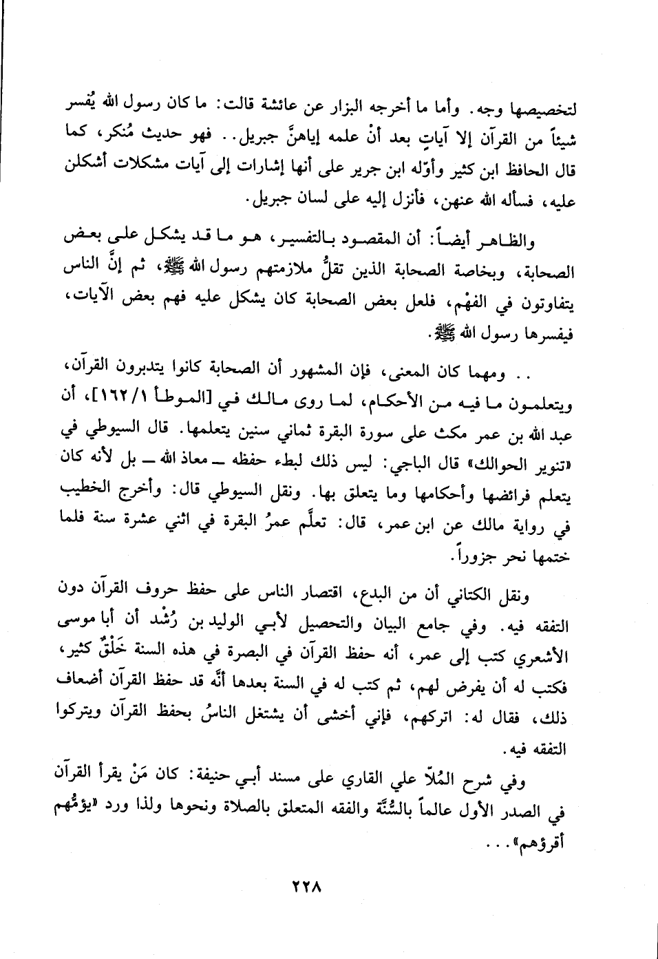 وفي شرح الملا علي القاري على مسند ابي حنيفة: كان من يقرأ القرآن في الصدر الأول عالماً بالسنة والفقه المتعلق بالصلاة ونحوها ولذا ورد ((يؤمهم أقرؤهم)) ... …