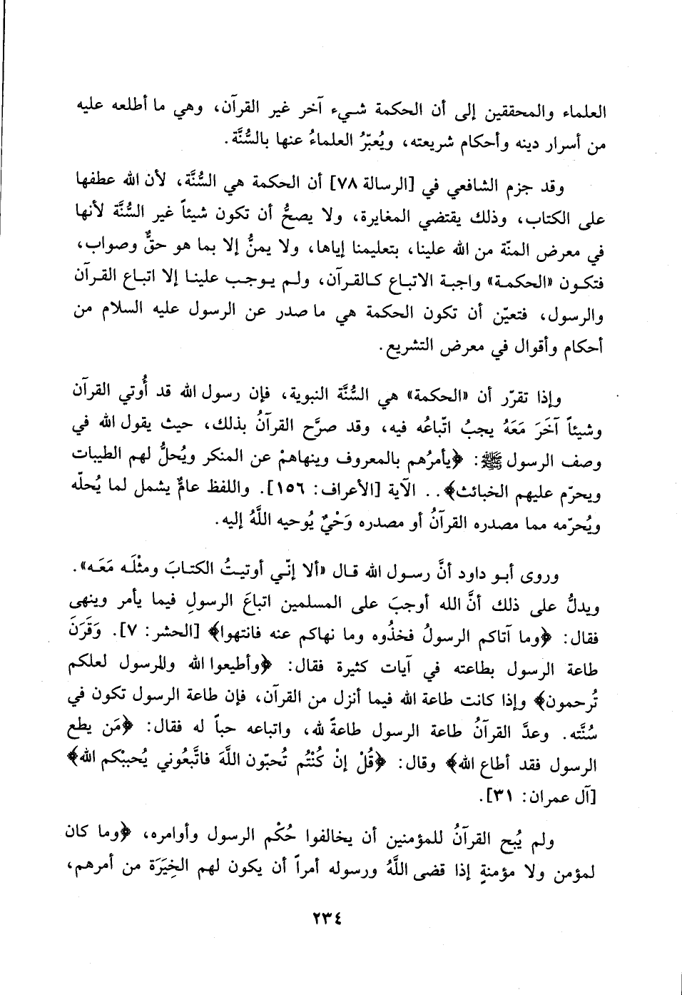 وقد جزم الشافعي في [الرسالة 78] أن الحكمة هي السنة، لأن الله عطفها على الكتاب، وذلك يقتضي المغايرة، ولا يصح أن تكون شيئاً غير السنة لأنها في معرض المنة من الله علينا، بتعليمنا إياها، ولا يمن إلا بما هو حق وصواب، فتكون ((الحكمة)) واجبة الاتباع كالقرآن، ولم يوجب علينا إلا اتباع القرآن والرسول، فتعين أن تكون الحكمة هي ما صدر عن الرسول عليه السلام من أحكام وأقوال في معرض التشريع.