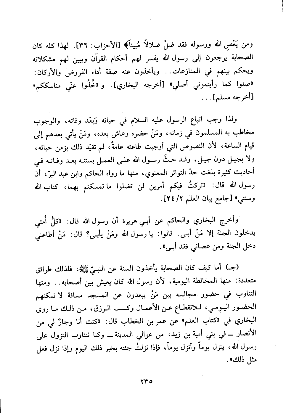 و ((خذوا عني مناسككم)) [أخرجه مسلم] ... ولذا وجب اتباع الرسول عليه السلام في حياته وبعد وفاته، والوجوب مخاطب به المسلمون في زمانه، ومن حضره وعاش بعده، ومن يأتي بعدهم إلى قيام الساعة، لأن النصوص التي اوجبت طاعته عامة، لم تقيد ذلك بزمن حياته، ولا بجيل دون جيل، وقد حث رسول الله على العمل بسنته بعد وفاته في أحاديث كثيرة بلغت حد التواتر المعنوي، منها ما رواه الحاكم وابن عبد البر، أن رسول الله قال: ((تركت فيكم امرين لن تضبوا ما تمسكتم بهما، كتاب الله وسنتي)) [جامع بيان العلم 2/ 24].